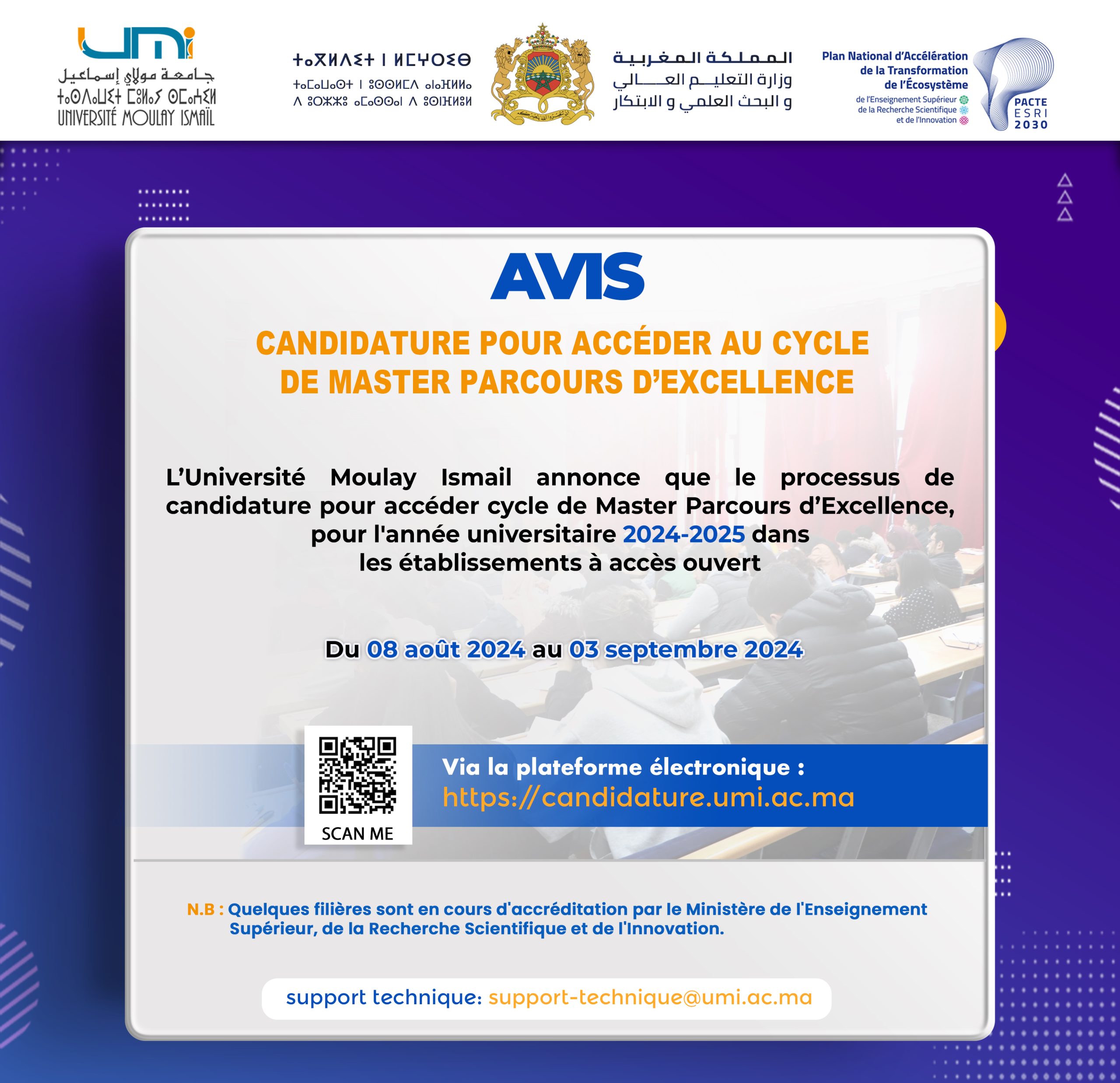 إعـــــلان عن فتح باب الترشيح لولوج سلك الماستر مسار التميز Vous devriez également aimer Turquie : Bourses de mobilité Erasmus+ pour Etudiants5 novembre 2019 Appel à candidatures au concours STARTECH AFRICA’2420 mars 2024 Un webinaire sur les etudes doctorales a L’UMI12 octobre 2020