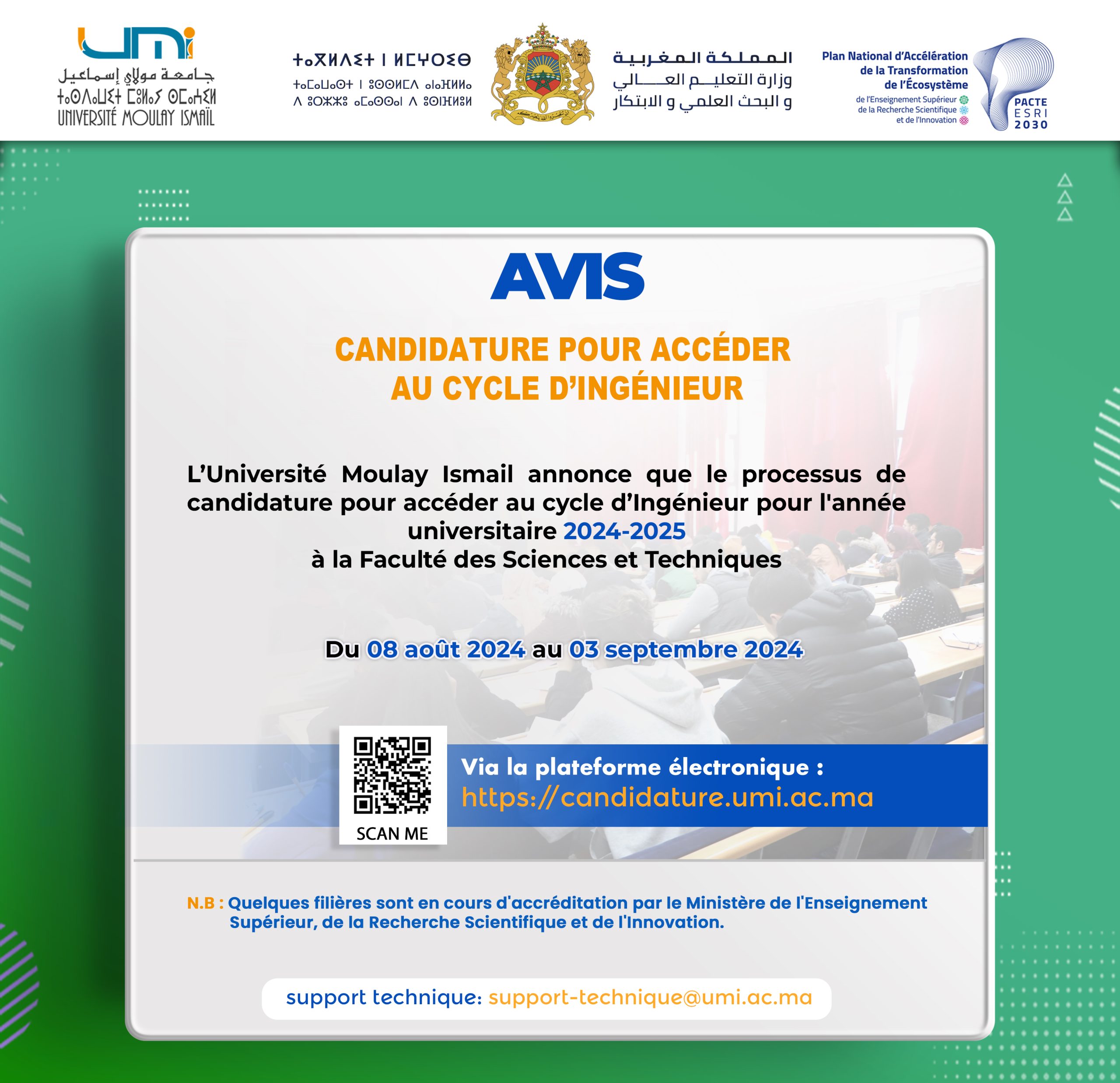 إعـــــلان عن فتح باب الترشيح لولوج سلك الهندسة Vous devriez également aimer النتائج النهائية للمقابلات الانتقائية لشغل منصبي : – رئيس قسم نظم المعلومات – رئيس قسم التكوين20 juillet 2021 Journée d’Etude sur « La migration marocaine et citoyenneté »14 décembre 2012 Programme des rencontres de consultation sur les assises régionales de la Région Darâa-Tafilalt14 mars 2022