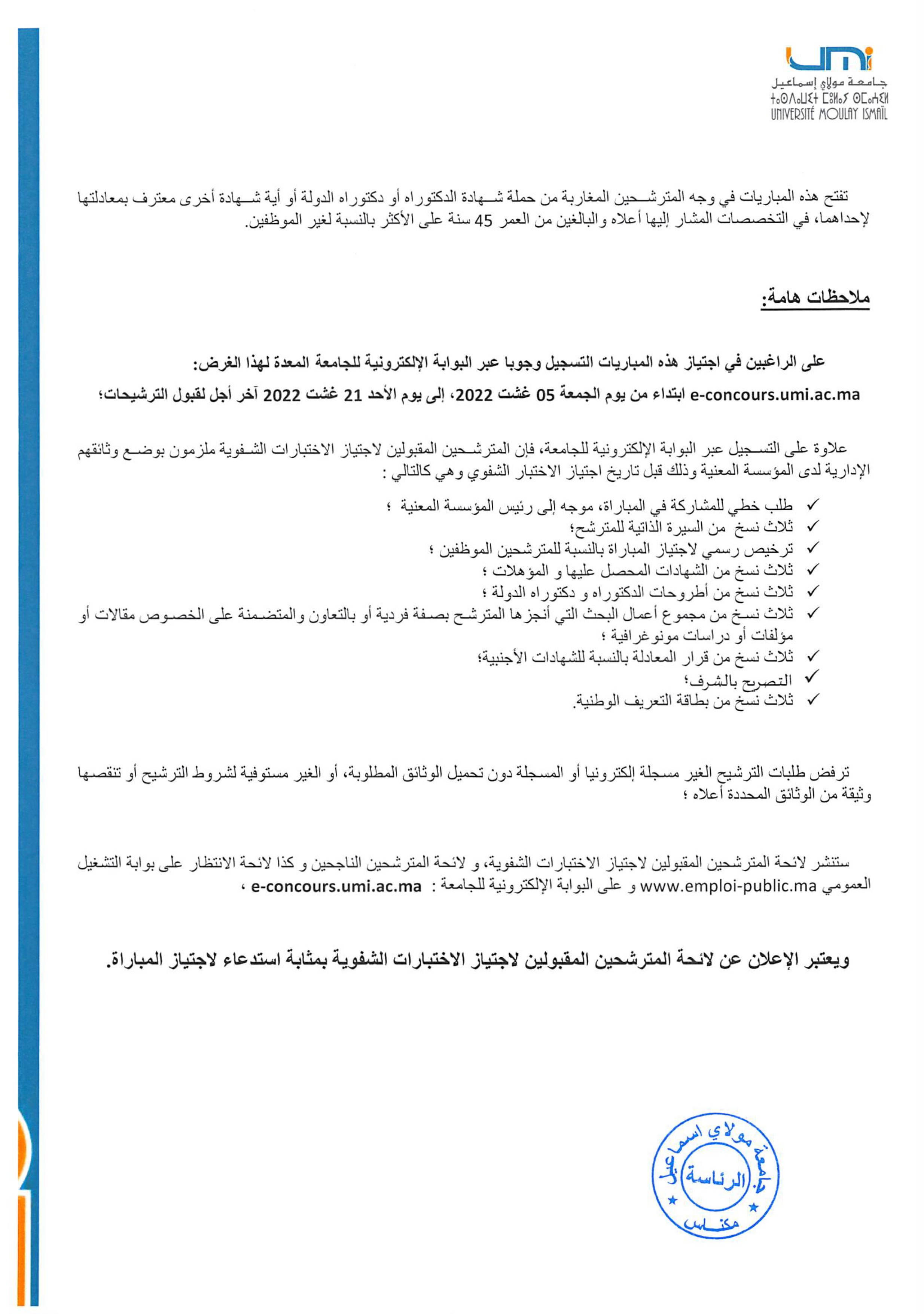 Annonce concours E-CH Ss 05-09-22 Vous devriez également aimer إعـــــــلان عن لائحة المترشحين المقبولين لاجتياز المقابلة الانتقائية لشغل منصب المسؤولية الشاغر برئاسة جامعة مولاي إسماعيل24 mars 2025 مباراة توظيف أساتذة محاضرين لفائدة الكلية المتعددة التخصصات بالرشيدية – منصب واحد- تخصص: الفرنسية28 juillet 2024 Appel aux étudiantes et étudiants de l’Université Moulay Ismail28 février 2022