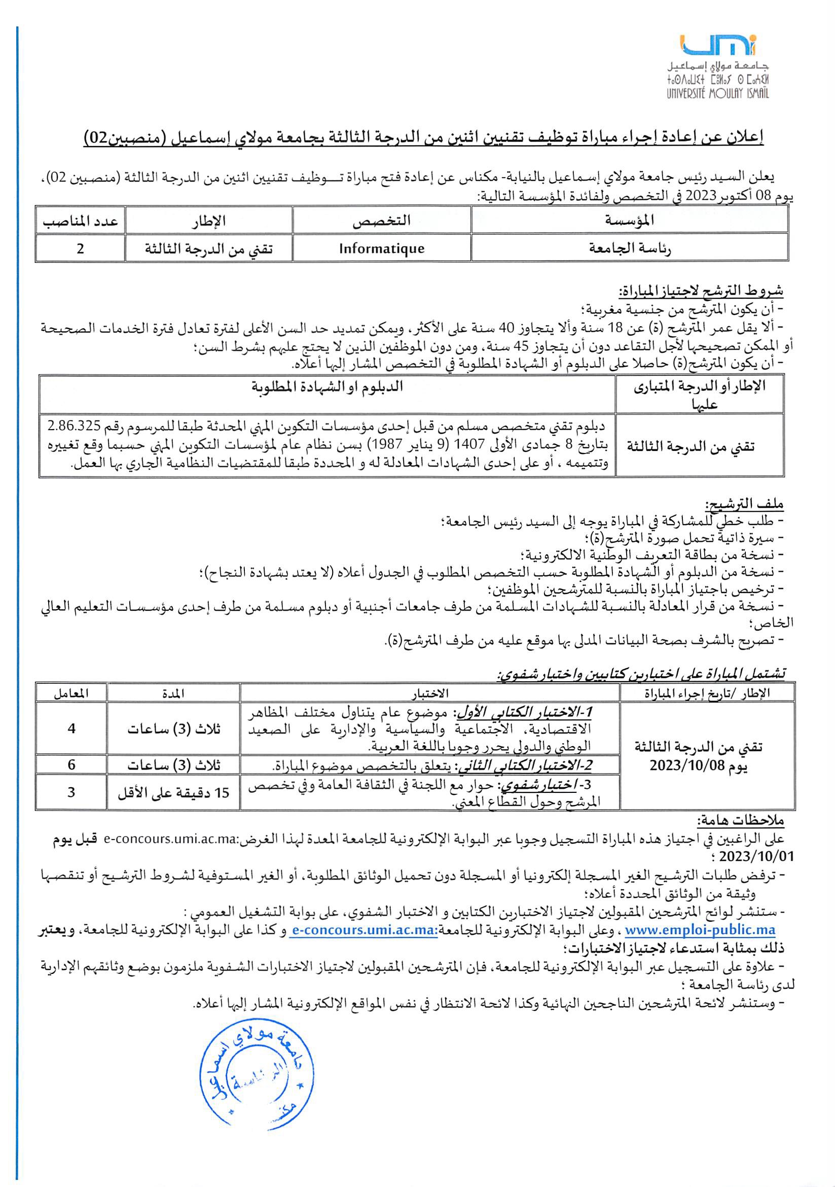 Vous devriez également aimer Union-Africaine / Appels à candidatures pour l’Inscription à l’Université Panafricaine16 avril 2018 النتائج النهائية لمباراة توظيف أساتذة محاضرين لفائدة كلية العلوم والتقنيات بالرشيدية (ثلاث مناصب (03) – Genie Logiciel : تخصص2 janvier 2025 Appel à Candidature pour Mobilité en Italie (Université Ca’Foscari -Venise)14 septembre 2021