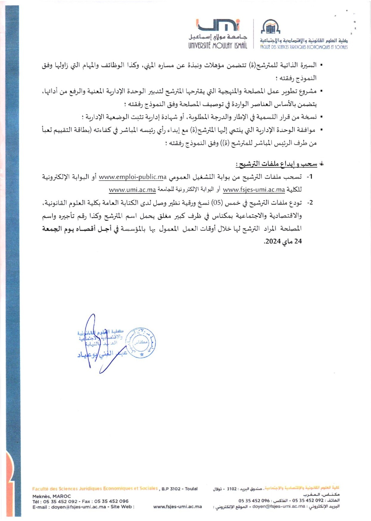 إعلان عن فتح باب الترشيح لشغل مناصب رؤساء المصالح الشاغرة بكلية العلوم القانونية و الاقتصادية و الاجتماعية مكناس (3 مناصب )