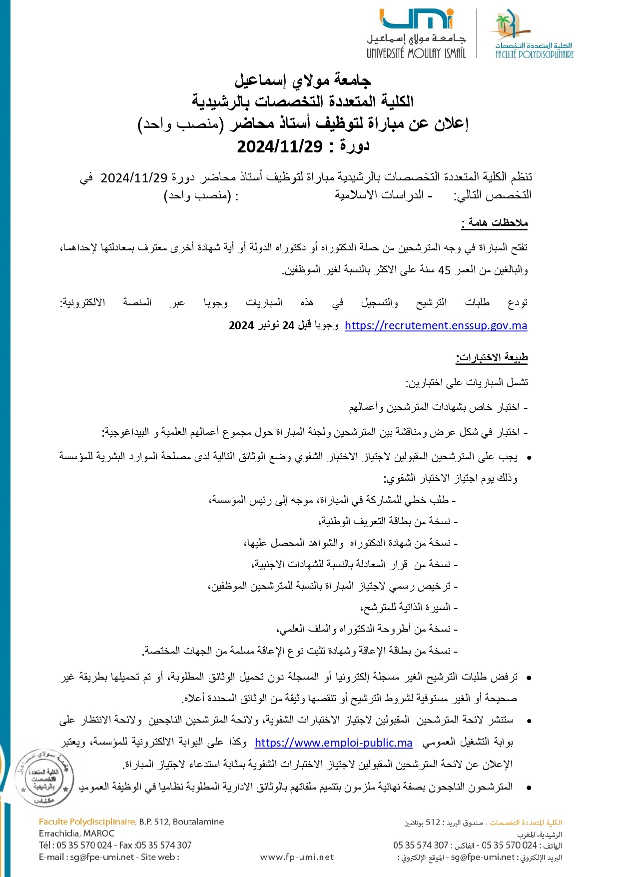 إعلان عن مباراة لتوظيف أستاذ محاضر (منصب واحد) – تخصص : الدراسات الإسلامية – بالكلية المتعددة التخصصات بالرشيدية Vous devriez également aimer INFORMATIQUE : النتائج النهائية لتوظيف أستاذ محاضر-كلية الآداب والعلوم الإنسانية – تخصص17 octobre 2024 UMI est classée la 1ère Université publique au Maroc 🇲🇦10 octobre 2024 Bourses d’études en Thesaurus Polonaie8 janvier 2020