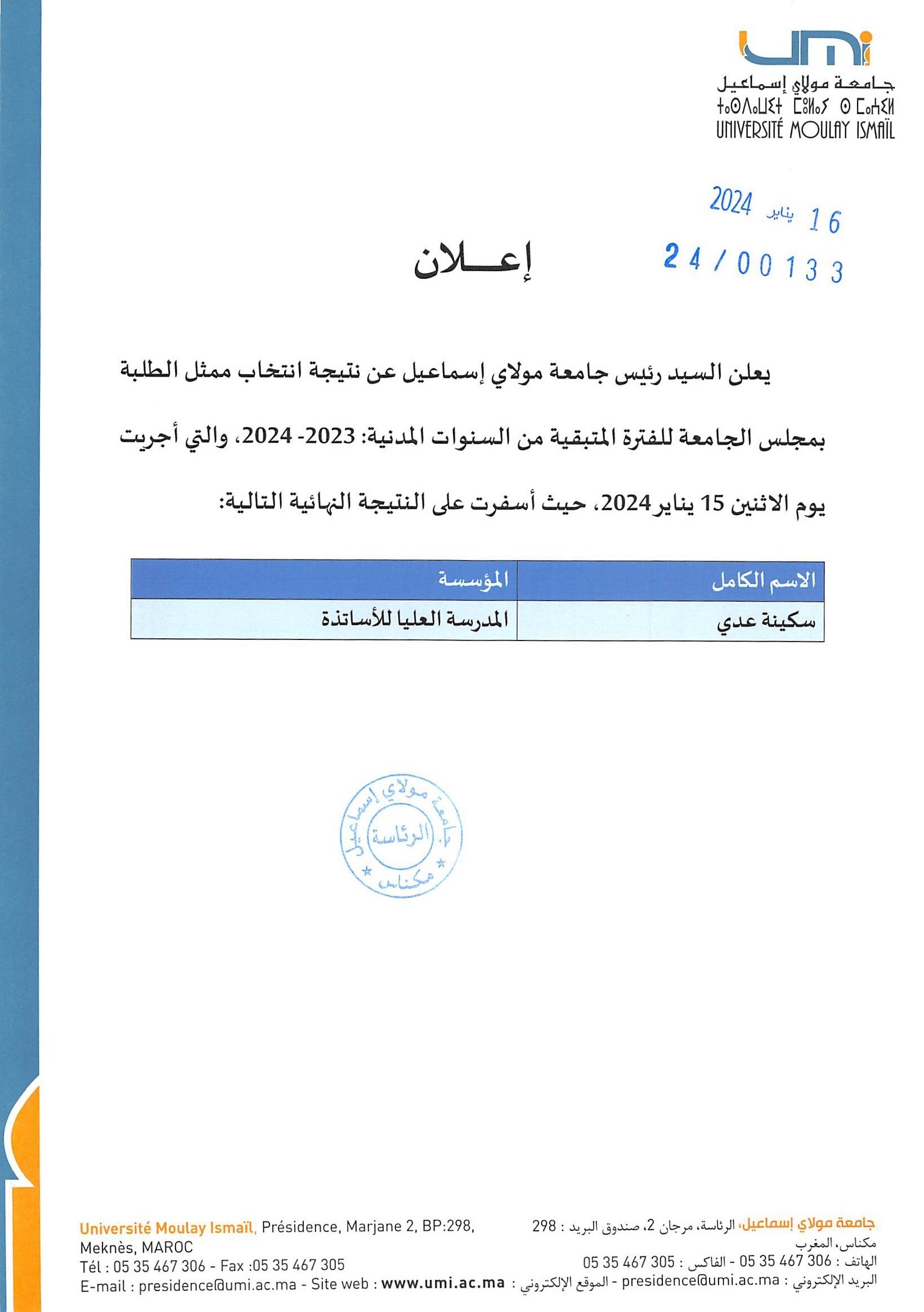 إعلان عن نتيجة انتخاب ممثل الطلبة بمجلس الجامعة للفترة المتبقية من السنوات المدنية: 2023- 2024 Vous devriez également aimer Call for papers for an international conference in Tunisia3 octobre 2013 Caravane Erasmus+ bientôt à la Faculté des Sciences et Techniques – Errachidia15 avril 2019 La Rentrée Universitaire 2021-2022 » Vaccinés ensemble, la santé pour tous et par tous « 2 septembre 2021