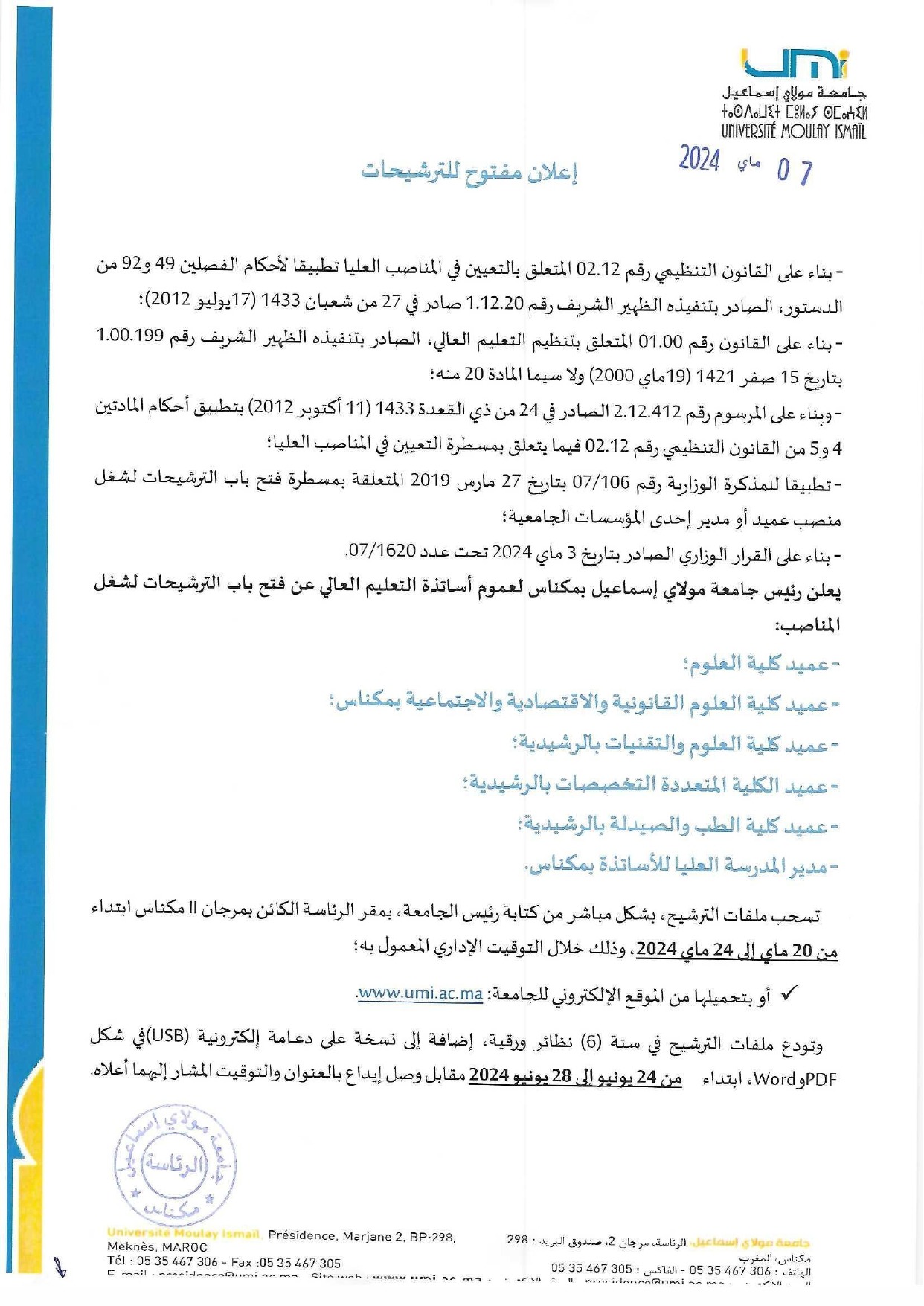 يعلن السيد رئيس جامعة مولاي إسماعيل بمكناس لعموم أساتذة التعليم العالي عن فتح باب الترشيحات لشغل المناصب التالية