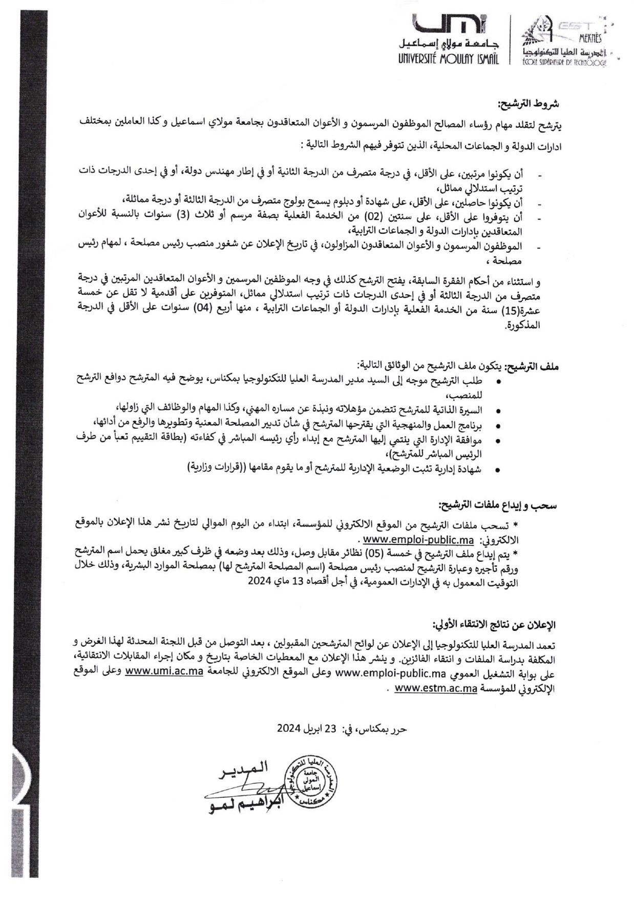 اعلان إعادة فتح باب الترشيح لشغل منصب رئيس مصلحة المعلوميات بالمدرسة العليا للتكنولوجيا بمكناسالكتابة العامة -توصيف المهام رئيس مصلحة المعلوماتية Vous devriez également aimer 📢 Appel à candidatures : Physics League Across Numerous Countries for Kick-Ass Students (PLANCKS)12 février 2024 Espagne : Appel à Candidature – Erasmus+16 octobre 2017 النتيجة النهائية لمباراة توظيف أستاذ محاضر تخصص : تاريخ المغرب28 octobre 2024
