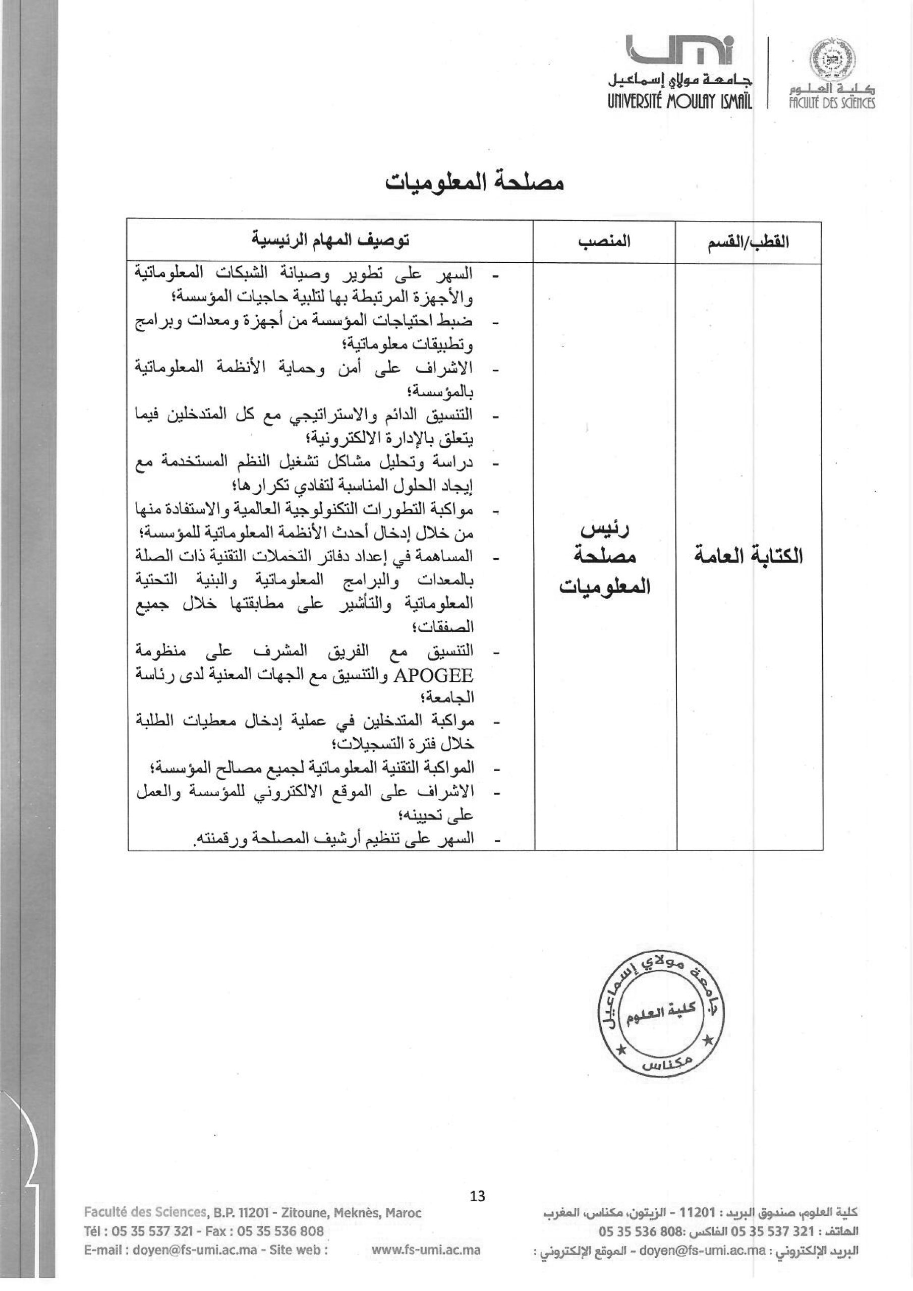 | رئيس مصلحة الشؤون الطلابية والاحصائيات وتتبع الخريجين | CHEF DE SERVICE DES AFFAIRES ESTUDIANTES, DES STATISTIQUES ET DE SUIVI DE L’INSERTION DES LAURÉATS | 22/12/2023 | 12/01/2024 | |