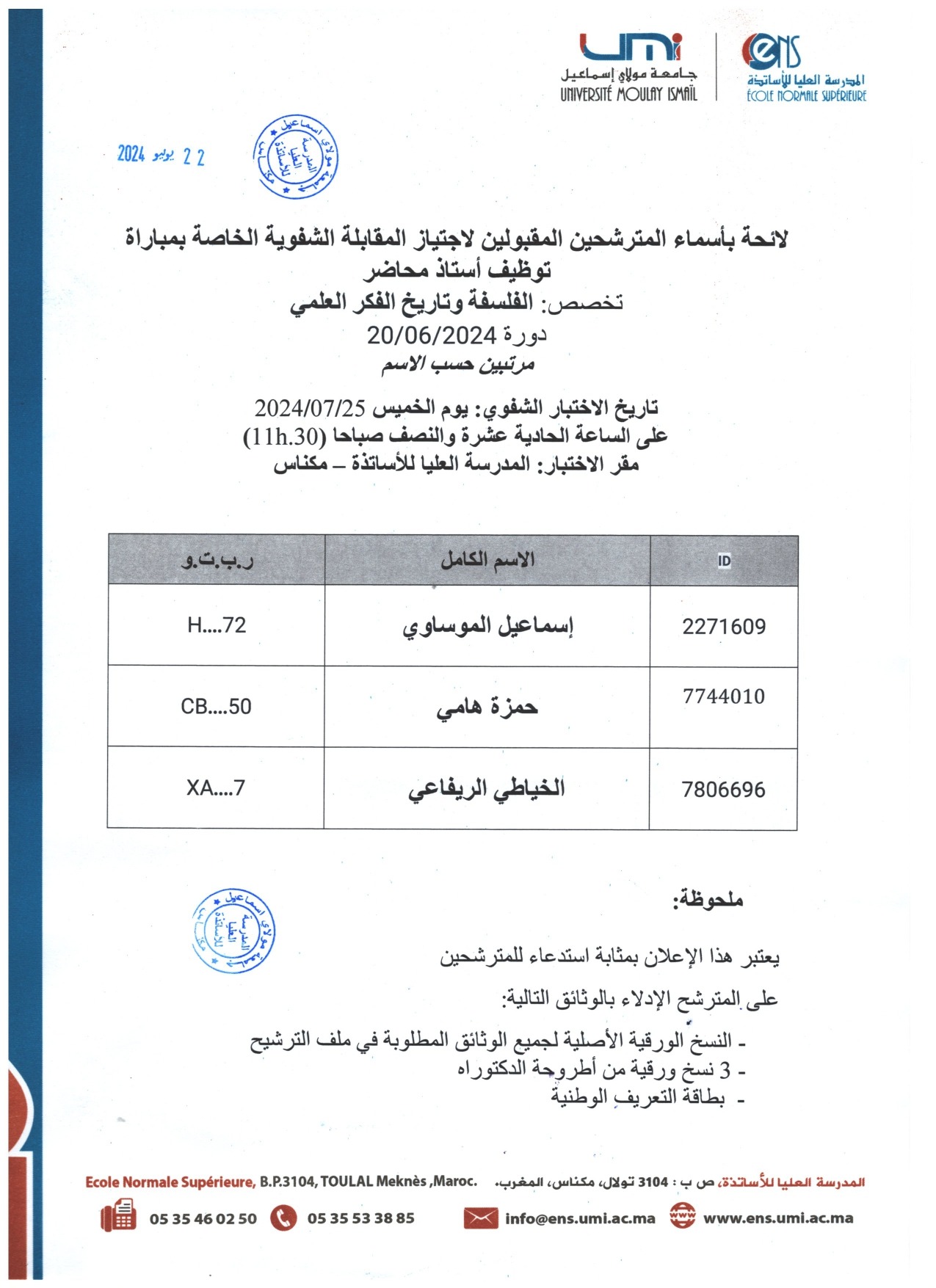 Science physiques : لائحة المترشحين المقبولين لاجتياز المقابلة الشفوية الخاصة بمباراة توظيف أستاذ محاضر- تخصص29 octobre 2024