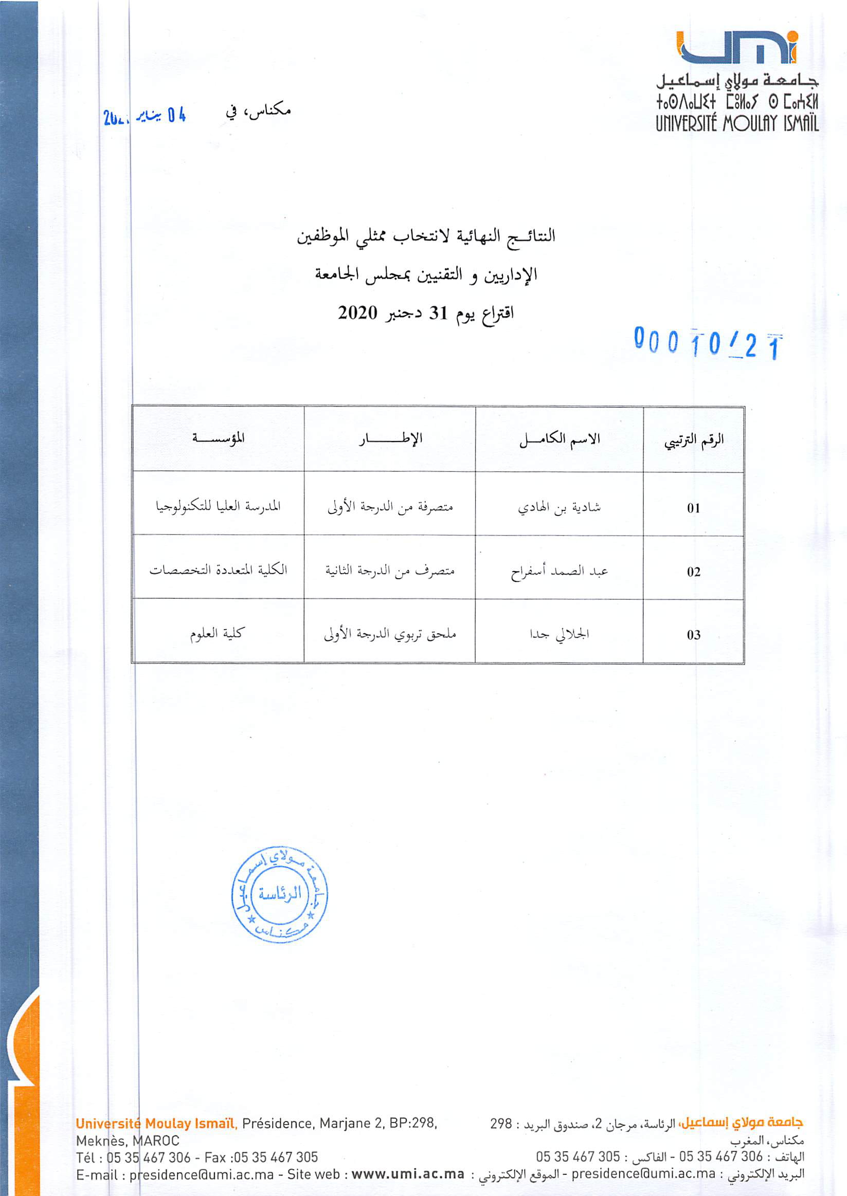 Vous devriez également aimer إعلان عن فتح باب الترشيحات لشغل منصب عميـد أومدير مؤسسات تابعة للجامعة9 décembre 2013 إعلان عن إعادة فتح باب الترشيح لشغل مناصب رؤساء مصالح بكلية العلوم بمكناس27 février 2025 Inscription des admis au TAFEM 2021 – ENCG- Université Moulay Ismail26 juillet 2021