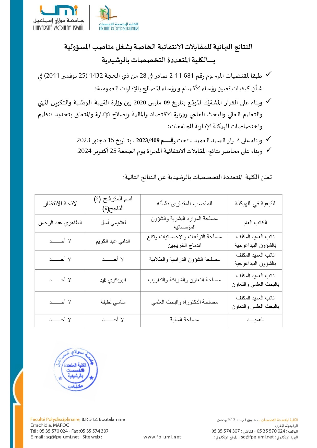 النتائج النهائية للمقابلات الانتقائية الخاصة بشغل مناصب المسؤولية بالكلية المتعددة التخصصات بالرشيدية Vous devriez également aimer النتيجة النهائية لمباراة توظيف أستاذ محاضر تخصص : تاريخ المغرب28 octobre 2024 Fatima Al Fihri project: 2nd WEBINAR for the second call for applications (EMA2 Lot 1)27 janvier 2014 Liste nominative des candidats sélectionnés à passer les épreuves écrites pour le recrutement de 3 techniciens de 3ᵉ grade (Spécialité INFORMATIQUE) Session 05/11/2023.3 novembre 2023
