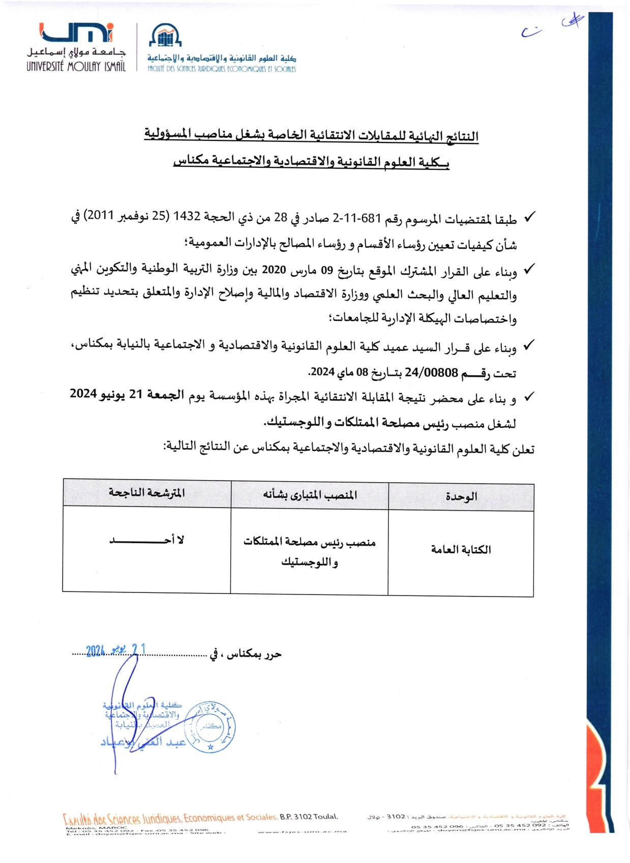 النتائج النهائية للمقابلة الانتقائية لشغل منصب رئيس مصلحة الممتلكات و اللوجستيك Vous devriez également aimer Programmes des cours sur la Radio Régionale de Meknès et la Radio MEDINA FM – du 04 au 09 Mai3 mai 2020 Régionalisation avancée au Maroc : dimensions et contraintes3 juin 2016 Accréditation des Licences d’Education à l’UMI14 juin 2019