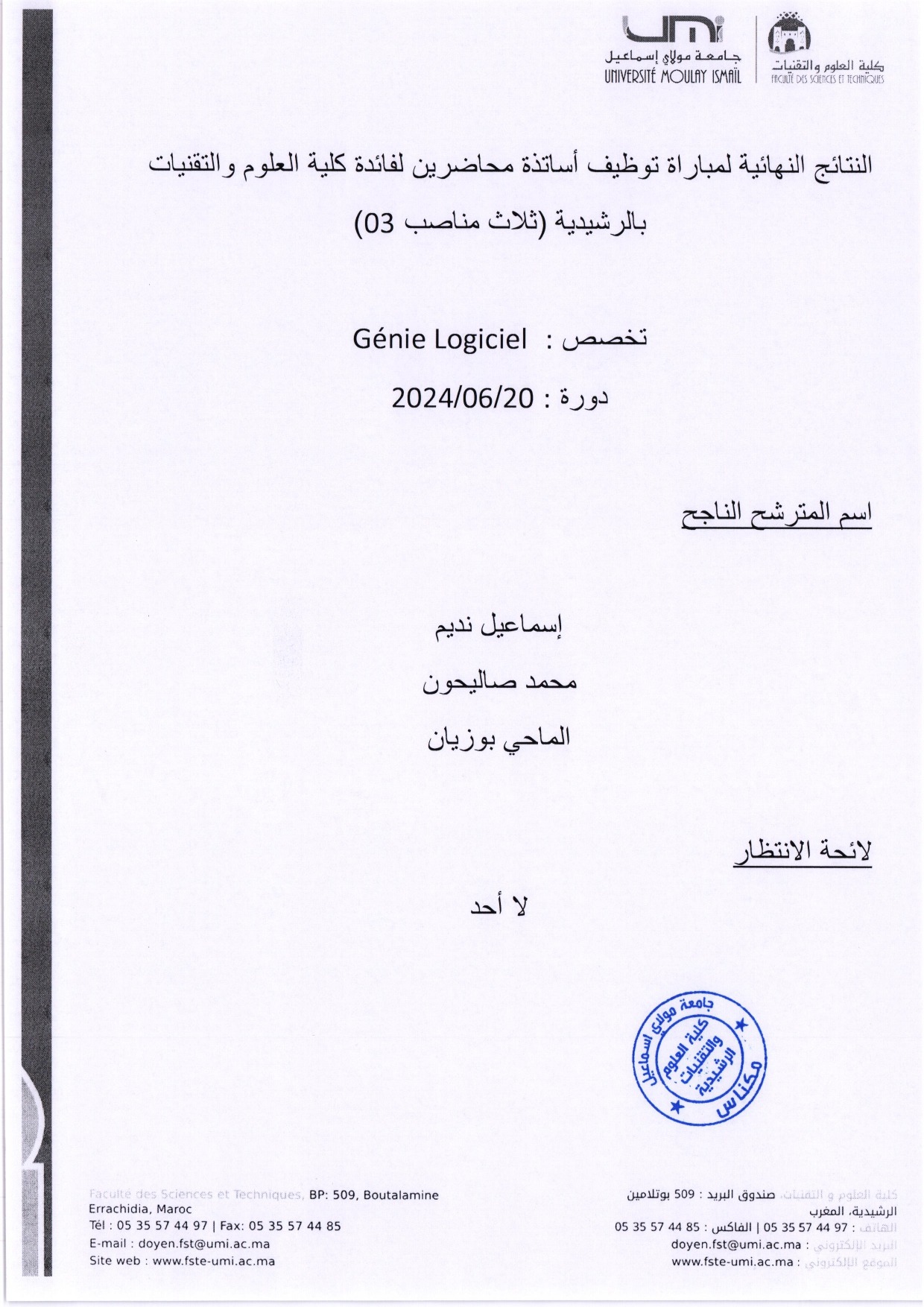 النتائج النهائية لمباراة توظيف أساتذة محاضرين لفائدة كلية العلوم والتقنيات بالرشيدية – ثلاث مناصب (03) Genie Logiciel : تخصص Vous devriez également aimer Appel à Candidatures: Obtenir une bourse d’excellence pour suivre une formation de haut niveau en Wallonie ou à Bruxelles8 janvier 2014 Nouvelle publication: « Femmes Artistes de Meknès Tafilalet »28 avril 2014 Projet de loi portant organisation de l’Enseignement Supérieur et de la Recherche Scientifique28 juin 2021
