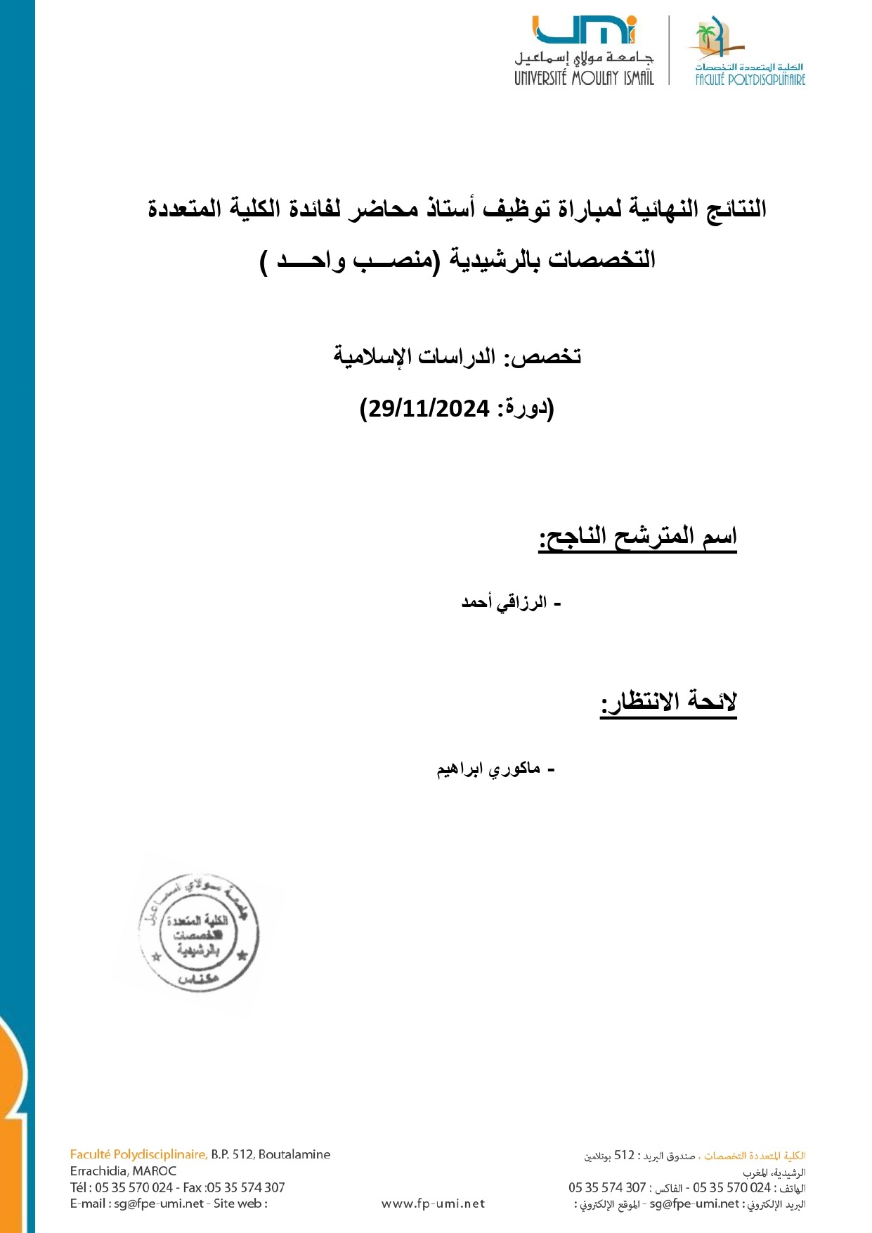 النتائج النهائية لمباراة توظيف أستاذ محاضر لفائدة الكلية المتعددة التخصصات بالرشيدية (منصب واحد ) تخصص : الدراسات الإسلامية Vous devriez également aimer Résultats finaux pour le concours de 5 MC (Économie, Économétrie, Fiscalité d’entreprise, Marketing digital, Finance-comptabilité) de la session du 20 juin 2024. 12 septembre 2024 لقاء علمي حول الأوراش الملكية الكبرى واستراتيجية التغيير12 novembre 2018 APPEL OUVERT À CANDIDATURE AU POSTE DE DIRECTEUR DU CENTRE D’INNOVATION ET DU TRANSFERT TECHNOLOGIQUE DE L’UNIVERSITÉ MOULAY ISMAIL17 juin 2022