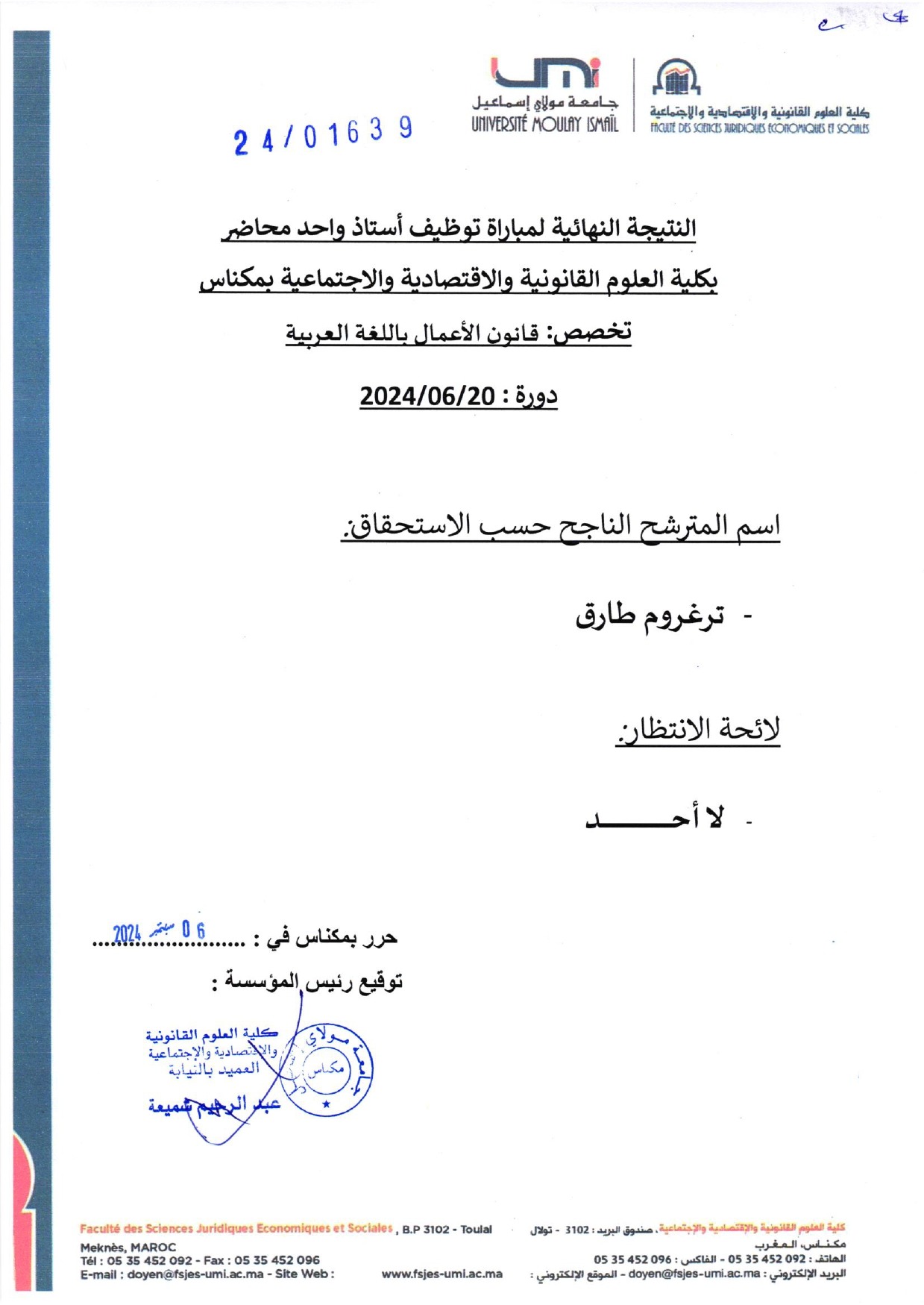 النتائج النهائية لمباريات توظيف أستاذ محاضر تخصص : قانون الاعمال باللغة العربي Vous devriez également aimer Appui aux équipes de recherche18 juin 2018 سنة هجرية سعيدة 1437 وكل عام وأنتم بخير13 octobre 2015 Nouveau Etablissement dans les Industries Agroalimentaire et Oléiculture de la Région Fès Meknès21 février 2017