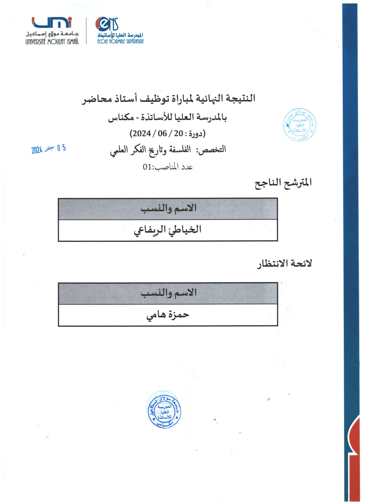 النتائج النهائية لمباريات توظيف أستاذ محاضر تخصص الفلسفة وتاريخ الفكر العلمي , Algèbre , Informatique Vous devriez également aimer Journée d’Etude sur « La migration marocaine et citoyenneté »14 décembre 2012 4ème édition du Concours Francophone International « Ma thèse en 180 secondes »31 janvier 2017 CONVOCATION DES CANDIDATS – CONCOURS MC17 juillet 2024