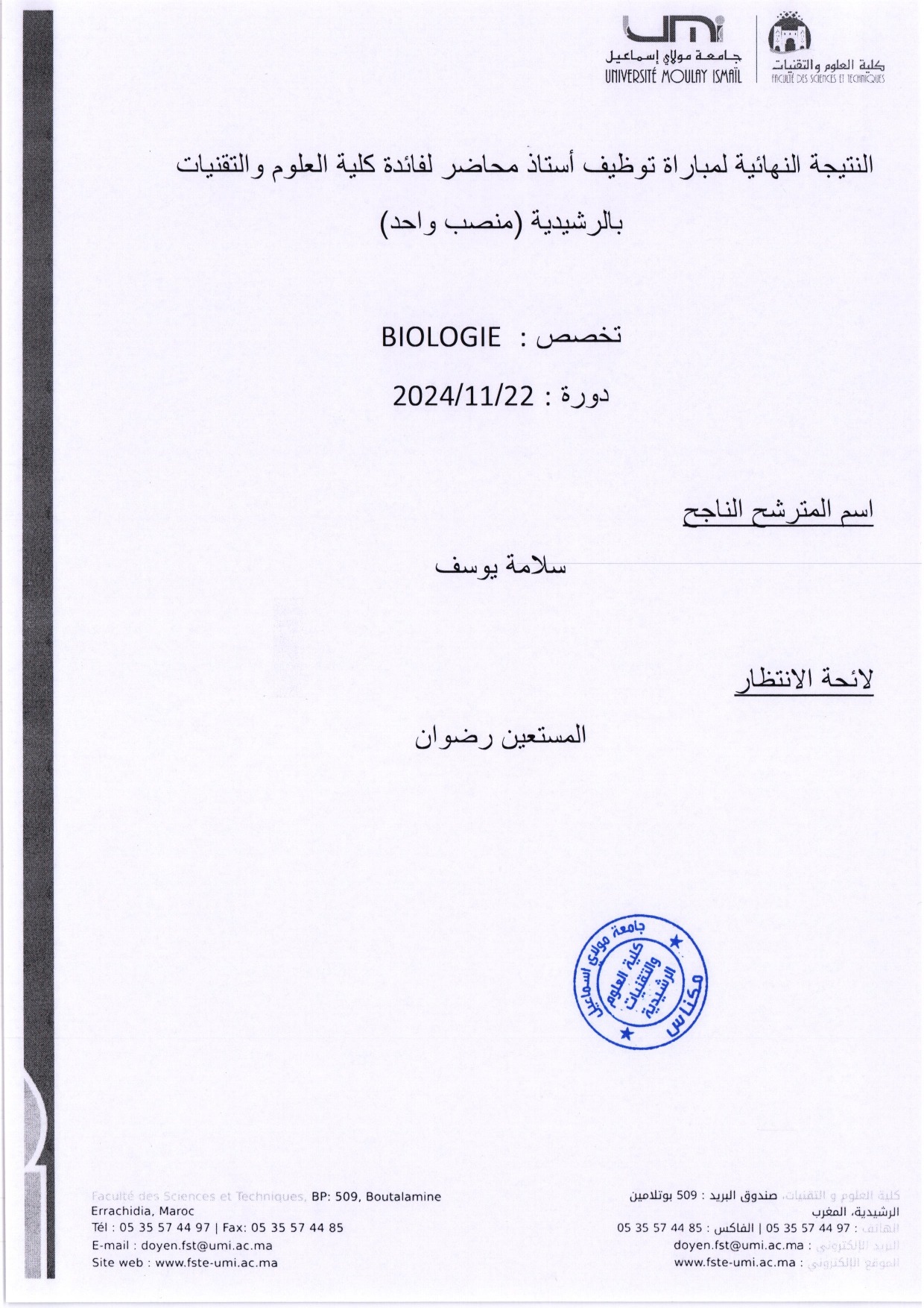 النتيجة النهائية لمباراة توظيف أستاذ محاضر لفائدة كلية العلوم والتقنيات بالرشيدية (منصب واحد) Biologie : تخصص Vous devriez également aimer الدورة التكوينية2 mars 2020 (TICE) : النتيجة النهائية لمباراة توظيف أستاذ محاضر تخصص22 octobre 2024 لائحة المترشحين المقبولين لاجتياز المقابلة الانتقائية لشغل منصب المسؤولية-قسم الشؤون الطلابية والحياة الجامعية10 janvier 2022