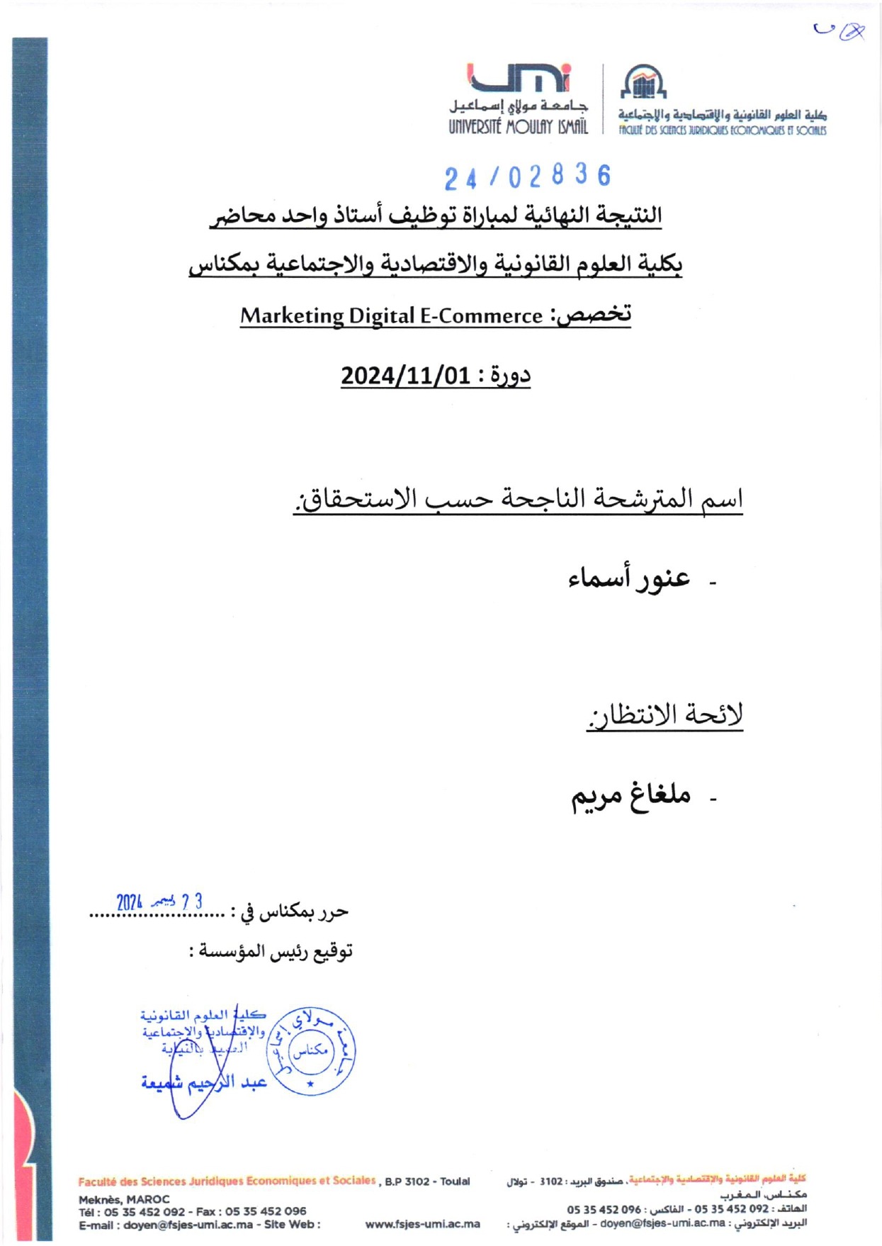 النتيجة النهائية لمباراة توظيف أستاذ واحد محاضر بكلية العلوم القانونية والاقتصادية والاجتماعية بمكناس Marketing Digital E-Commerce : تخصص Vous devriez également aimer Programmes Internationaux et d’Approfondissement – ENA France3 mars 2020 Liste des candidats convoqués pour l’oral du concours de la Biochimie3 décembre 2024 ANNONCE : ATELIERS PRATIQUES ET THEORIQUES VALORISATION DE PLANTES MEDICINALES ET AROMATIQUES29 novembre 2022