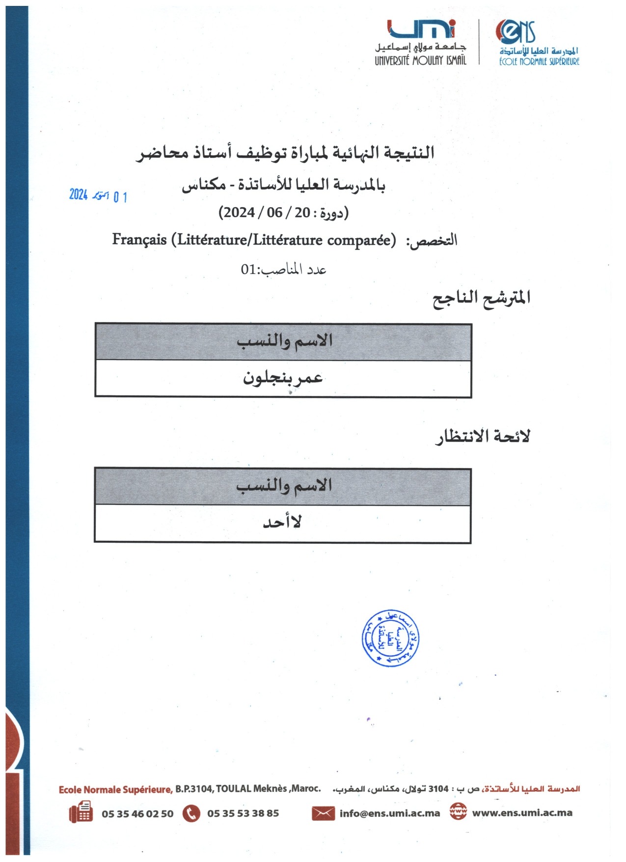النتيجة النهائية لمباراة توظيف أستاذ محاضرFrançais (Littérature/Littérature comparée): تخصص Vous devriez également aimer Conférence inaugurale 2017-201828 novembre 2017 Conseil d’Université7 mai 2019 ENSAM: Cérémonie de remise des diplômes aux lauréats de la 13ème promotion17 juillet 2014