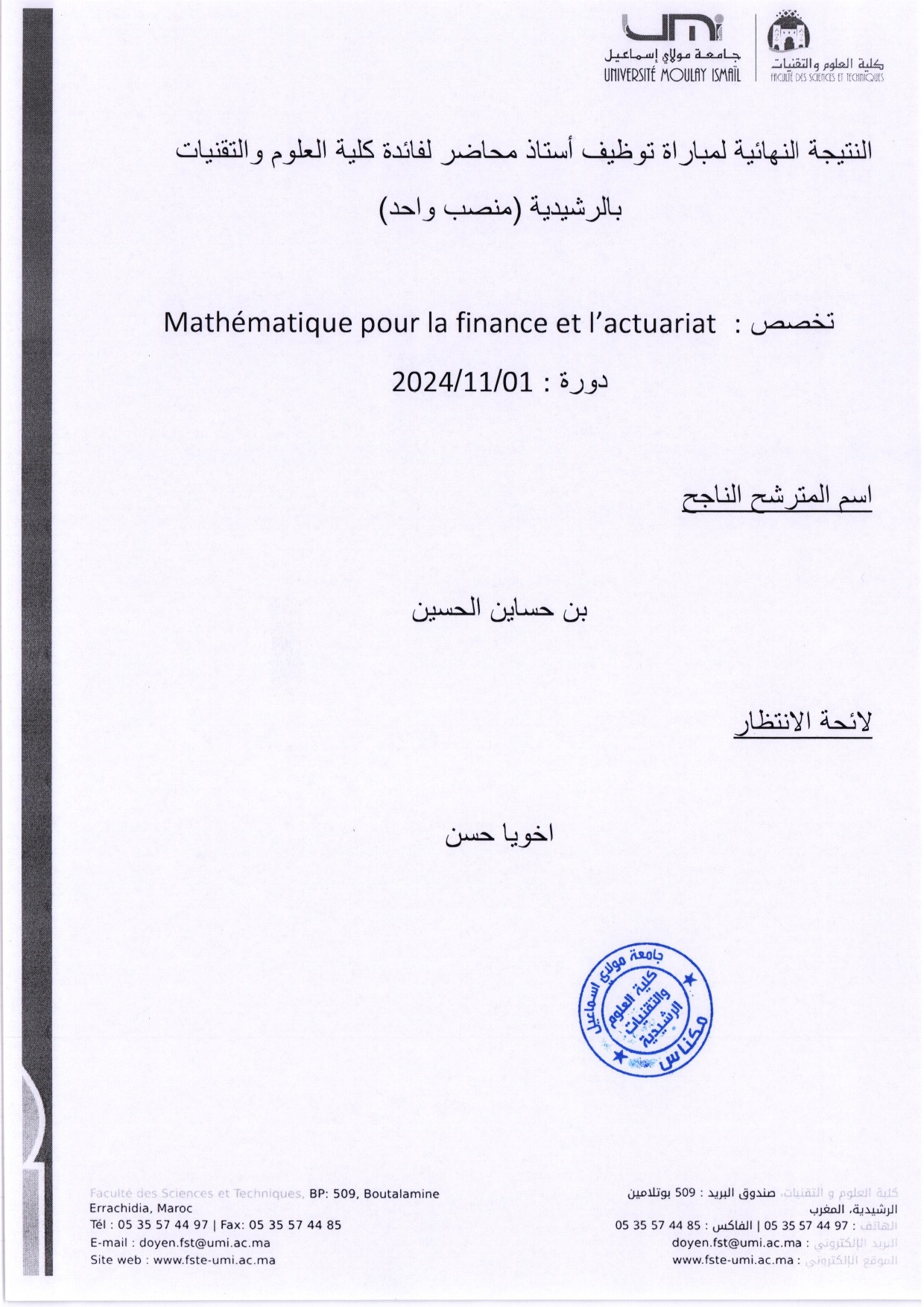 النتيجة النهائية لمباراة توظيف أستاذ محاضر لفائدة كلية العلوم والتقنيات بالرشيدية (منصب واحد) Mathématique pour la finance et l’actuariat : تخصص Vous devriez également aimer Cahiers des Normes Pédagogiques Nationales 201417 février 2014 Accréditation des Licences d’Education à l’UMI14 juin 2019 Annonce : Liste des convoqués pour passer les entretiens oraux pour la sélection des chefs de divisions des « Affaires générales » et des « Affaires estudiantines et de la vie universitaire ».5 décembre 2022