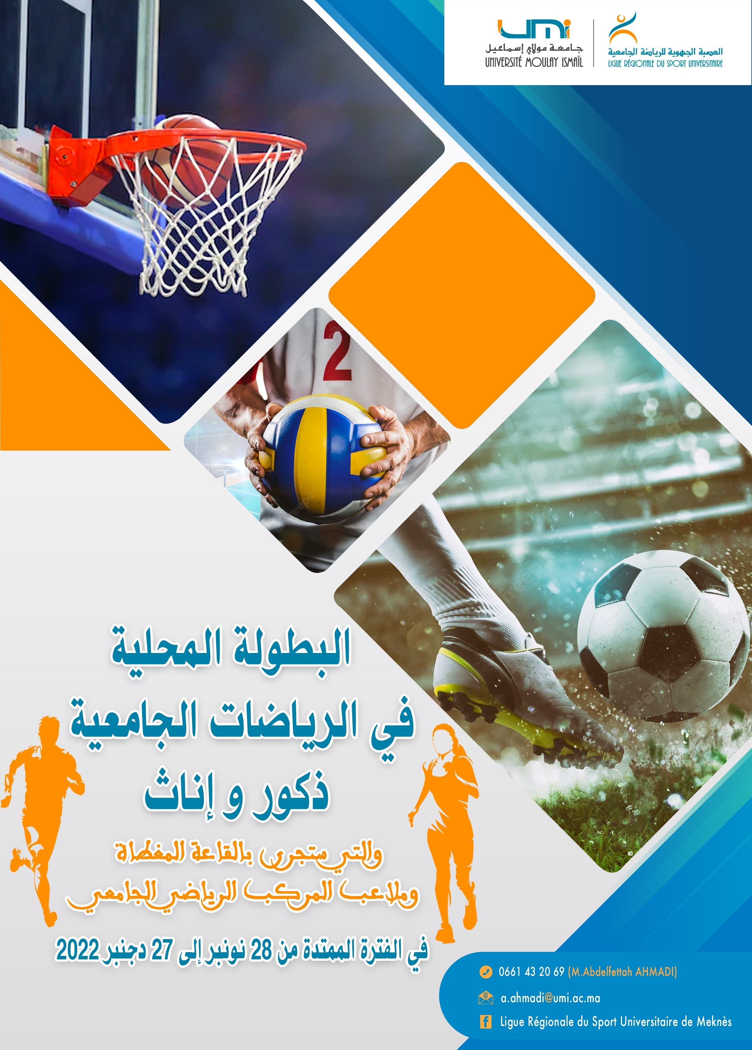 مباريات البطولة المحلية في الرياضات الجامعية ذكور وإناث والتي ستجرى بالقاعة المغطاة وملاعب المركب الرياضي الجامعي في الفترة الممتدة من 28 نونبر إلى 27 دجنبر2022