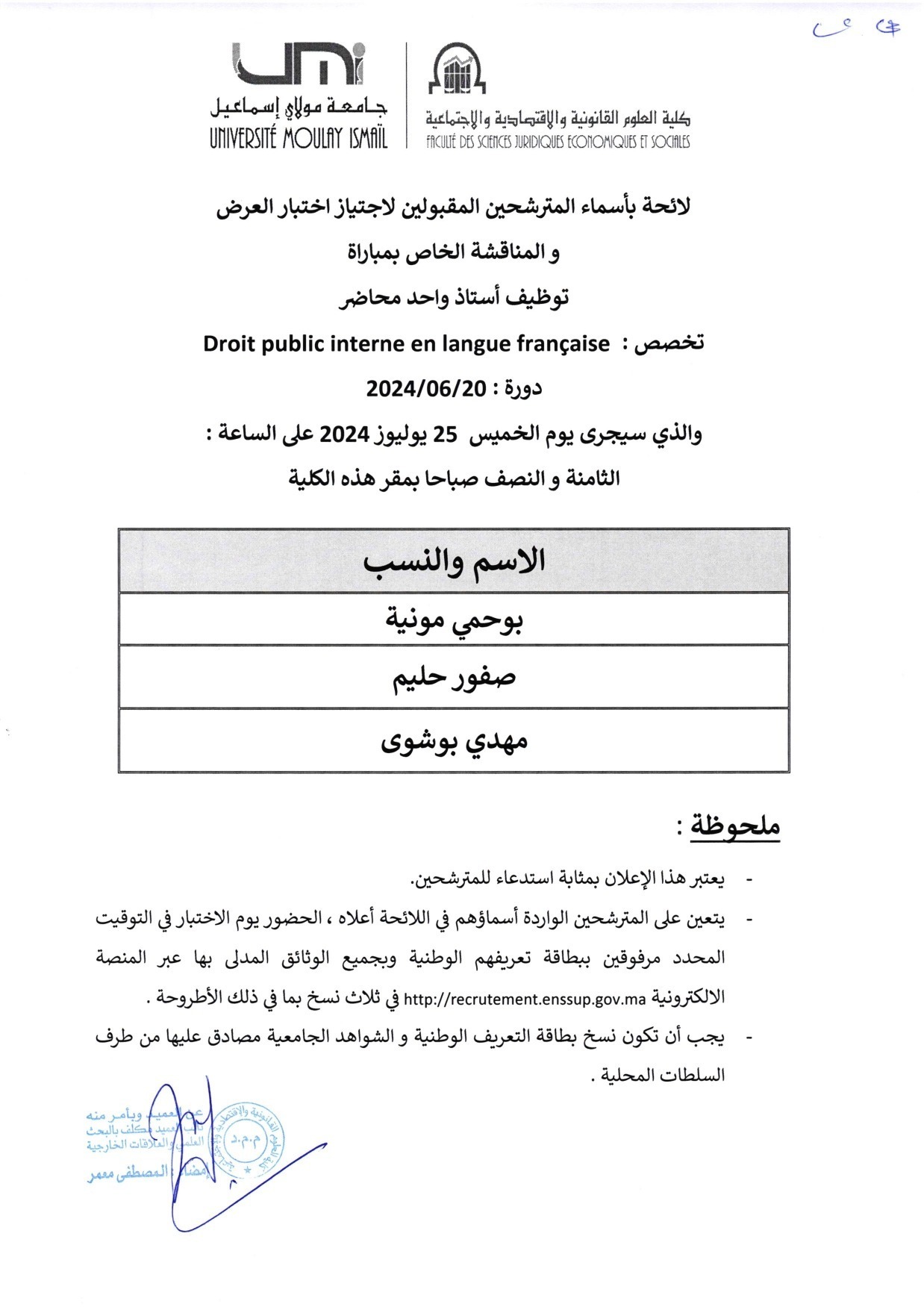 لائحة المترشحين المدعوين لاجتياز اختبار العرض و المناقضة لمباراة توظيف أستاذ محاضر تخصص : Droit public interne en langue française Vous devriez également aimer لائحة بأسماء المترشحين المقبولين لاجتياز اختبار العرض والمناقشة الخاص بمباراة توظيف أستاذ واحد محاضر – Intelligence Artificielle : تخصص11 décembre 2024 Appel à candidatures pour la bourse d’excellence de recherche au titre de l’année 20212 janvier 2021 Espagne: Bourses d’études de Master – 2019/20205 juillet 2019