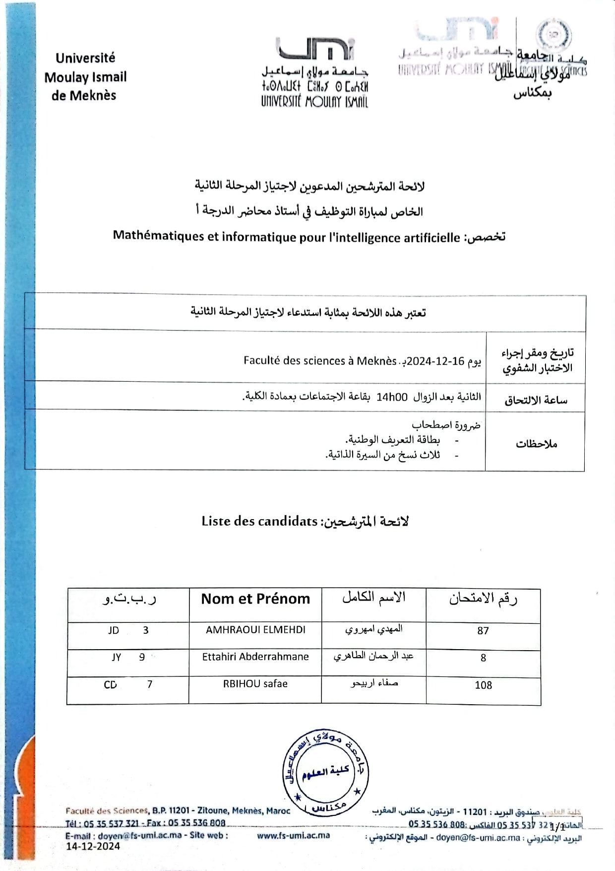 لائحة المترشحين المدعوين لاجتياز المرحلة الثانية الخاص لمباراة التوظيف في استاذ محاضر الدرجة أ Mathématiques et informatique pour l’intelligence artificielle : تخصص