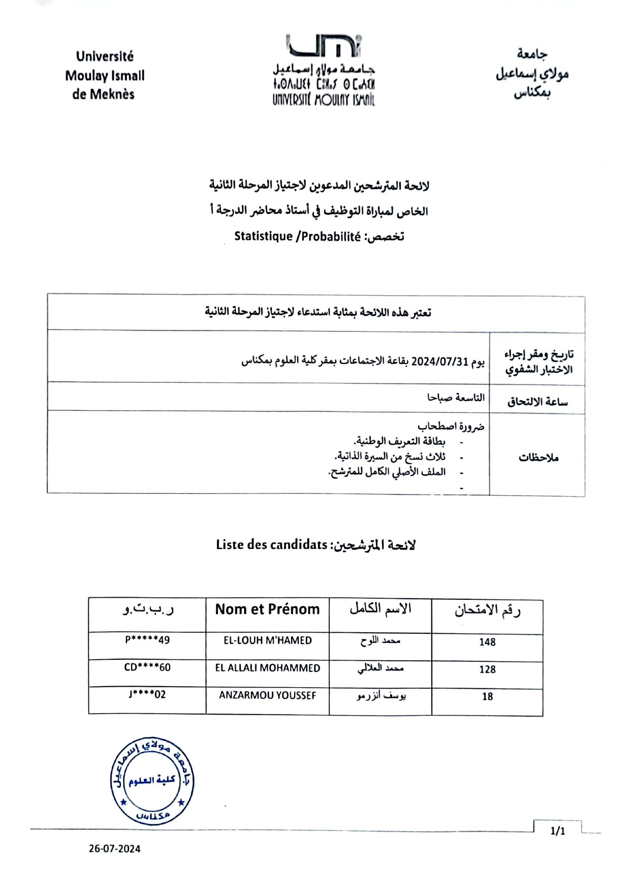 لائحة المترشحين المدعوين لاجتياز المرحلة الثانية الخاص لمباراة التوظيف في استاذ محاضر الدرجة أ Statistique / Probabilité : تخصص Vous devriez également aimer La liste des convoqués aux auditions du concours de recrutement d’un M.C en Management Stratégique, et qui aura lieu le Mercredi 18/12/2024 à l’ ENSAM Meknès14 décembre 2024 السنغال: منح التعاون9 septembre 2019 Journée Doctorale en Informatique et ses Applications (JDIA’14)4 juin 2014