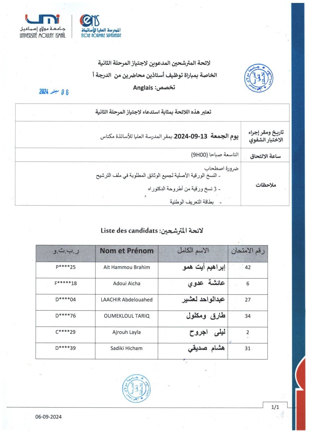 لائحة المترشحين المدعوين لاجتياز المرحلة الثانية الخاصة بمباراة توظيف أستاذين محاضرين من الدرجة أ تخصص: Anglais Vous devriez également aimer Appel à Candidature pour Mobilité en Pologne (Université Lublin de Technologie)7 février 2022 Annonce de la session de formation au profit des fonctionnaires concernés par les examens de l’aptitude professionnelle au titre de l’année 202129 novembre 2021 Colloque: 9éme édition Sous Thème:(Migration d’une approche sécuritaire vers une approche fondée sur les droits humains)15 décembre 2021