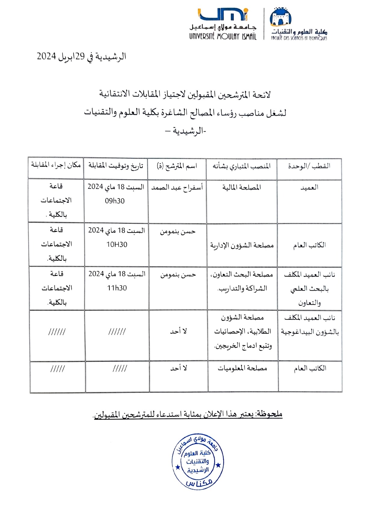 لائحة المترشحين المدعوين لاجتياز المقابلات الانتقائية لشغل مناصب رؤساء المصالح الشاغرة بكلية العلوم والتقنيات بالرشيدية https://www.emploi-public.ma/extranet/candidaturesEP_list.asp?msg=addLCOk&etat=findepot Vous devriez également aimer Vietnam: Offre de bourses (Prolongation)4 septembre 2018 Général Erasmus+ 2015: Appel à propositions15 décembre 2014 الذكرى الاربعون للمسيرة الخضراء المظفرة4 novembre 2015