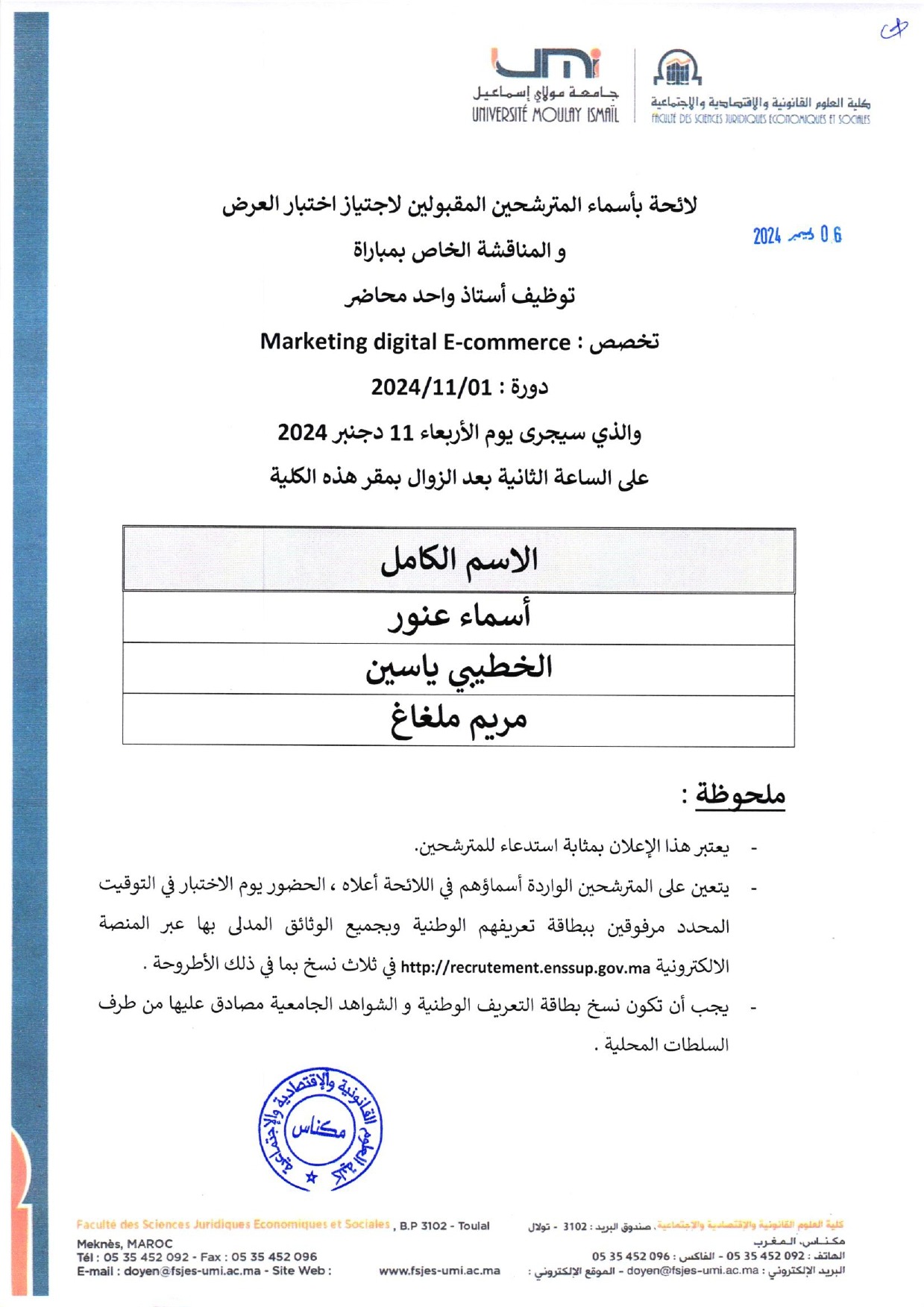 لائحة بأسماء المترشحين المقبولين لاجتياز اختبار العرض والمناقشة الخاص بمباراة توظيف أستاذ واحد محاضرMarketing digital E-commerce : تخصص Vous devriez également aimer Cérémonie de remise des diplômes du Master RME inaugurée par M. Lahcen DAOUDI, Ministre de l’Enseignement Supérieur8 octobre 2012 Programmes des cours sur la Radio Régionale de Meknès et la Radio MEDINA FM du 13 Mai12 mai 2020 FST-Errachidia: International Workshop on Applied Mathematics13 janvier 2017