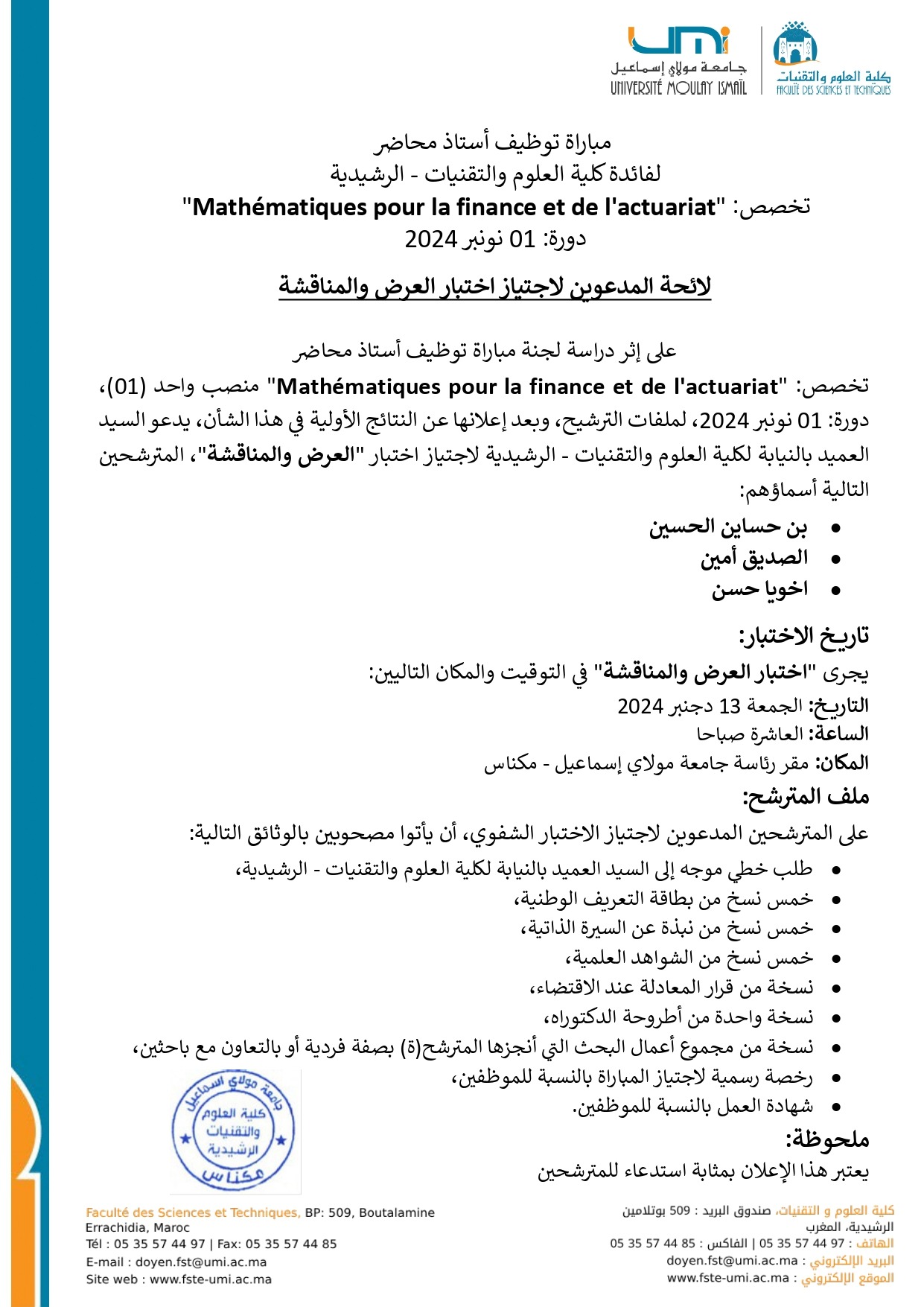 لائحة بأسماء المترشحين المقبولين لاجتياز اختبار العرض