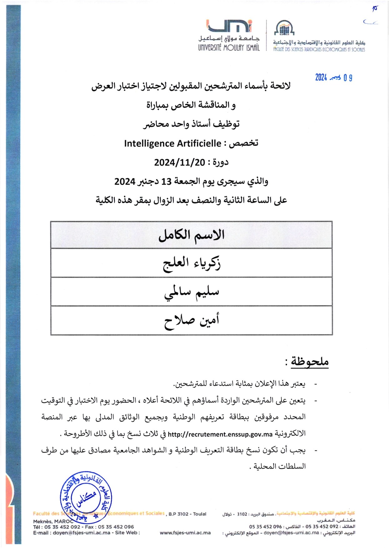 لائحة بأسماء المترشحين المقبولين لاجتياز اختبار العرض والمناقشة الخاص بمباراة توظيف أستاذ واحد محاضر Intelligence Artificielle : تخصص Vous devriez également aimer Intra-africa Academic Mobility scheme : Deadline 13 Mai 20208 avril 2020 Appel à communication FONCIMED 201814 mai 2018 Appel aux étudiantes et étudiants de l’Université Moulay Ismail4 mars 2022