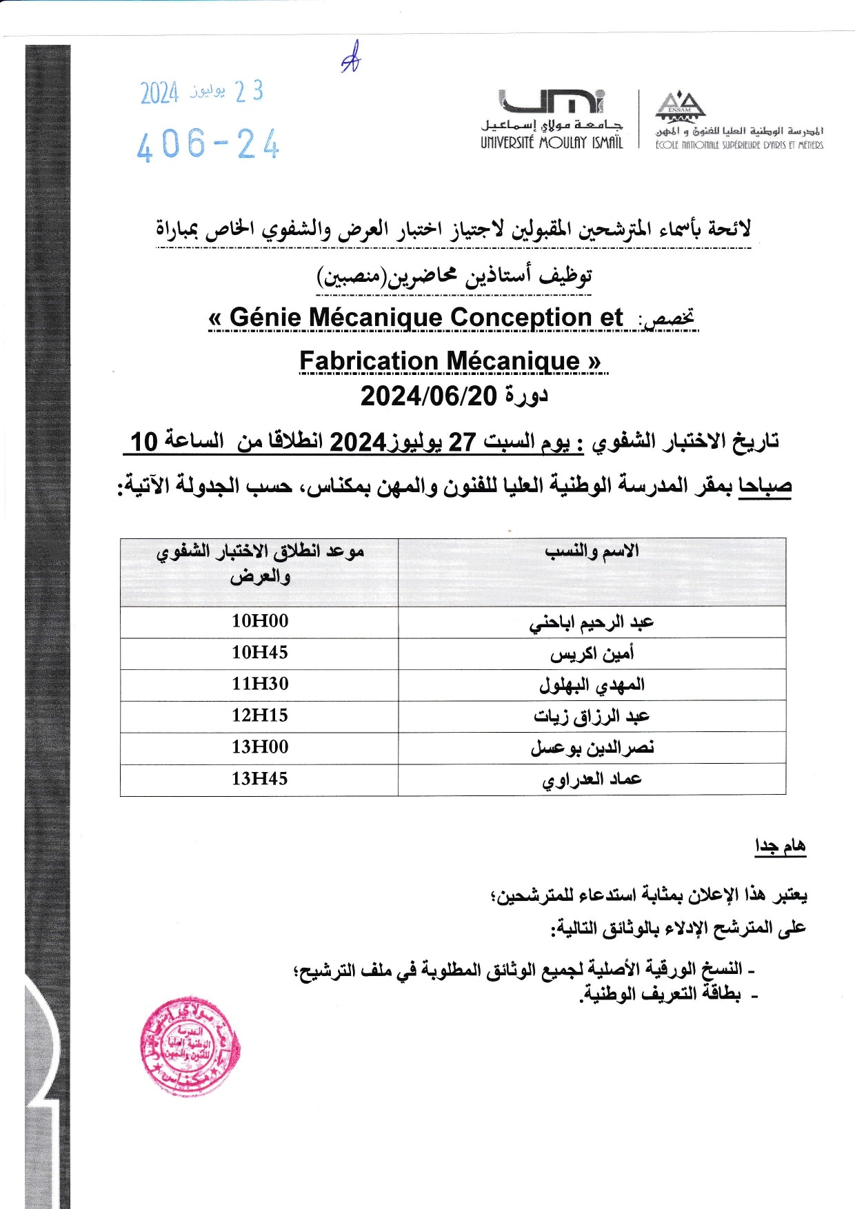 لائحة بأسماء المترشحين المقبولين لاجتياز اختبار العرض والشفوي الخاص بمباراة توظيف أستاذين محاضرين (منصبين) Génie Mécanique Conception et Fabrication Mécanique : تخصص Vous devriez également aimer AVIS AUX CANDIDATS AU CYCLE DOCTORAL30 septembre 2024 Formation Web of Sciences18 février 2019 Ecole de Recherche Géométrie Symplectique et Topologie Géométrique15 mai 2012