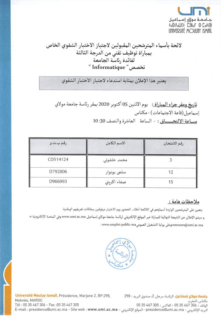 Vous devriez également aimer Annonce: Résultat final du concours de recrutement d’un technicien Spécialité: Informatique13 décembre 2021 Lancement de l’Appel à projets PHC Maghreb 202028 janvier 2019 إعلان عن إعادة إجراء مباراة توظيف تقني من الدرجة الثالثة دورة 30/09/20237 septembre 2023