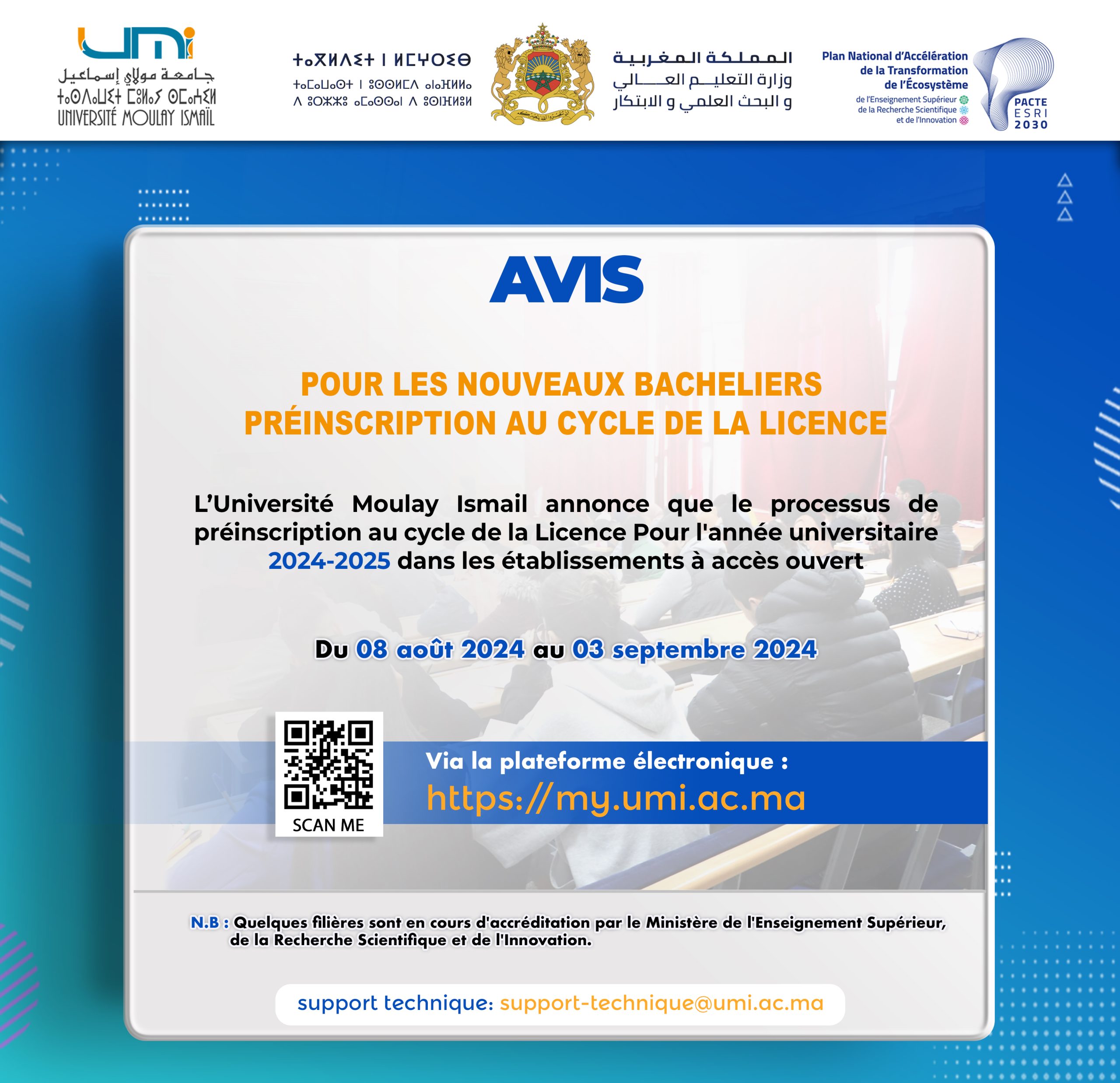 لفائدة حاملي شهادة البكالوريا عن فتح باب التسجيل القبلي بسلك الإجازة Vous devriez également aimer Happy New Year 20192 janvier 2019 Mobilité Erasmus+ Helsinki (Finlande) : Appel à Candidature12 juin 2017 لائحة باسم المترشحة المقبولة لاجتياز المقابلة الانتقائية لشغل منصب رئيس مصلحة الممتلكات و اللوجستيك16 juin 2024