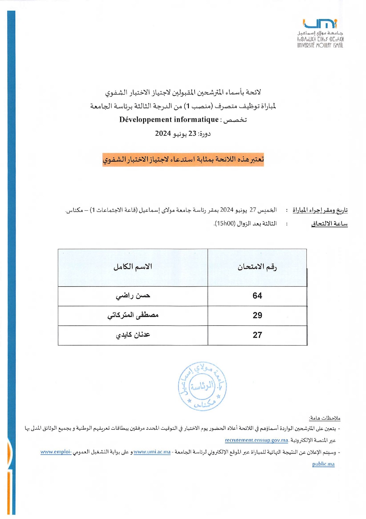 لوائح المترشحين المقبولين لاجتياز الاختبار الشفوي لمباريات توظيف الأطر الإدارية والتقنية بجامعة مولاي اسماعيل بمكناسيوم 27/06/2024 Vous devriez également aimer Aid Moubarak Said22 mai 2020 7ème Appel à Candidature pour les bourses de mobilité Erasmus+ à l’Université de Messina en Italie25 octobre 2022 Projet de Coopération Réseau ENSA (Maroc) et Polytech (France) à la Présidence de l’UMI de Meknès.7 février 2024