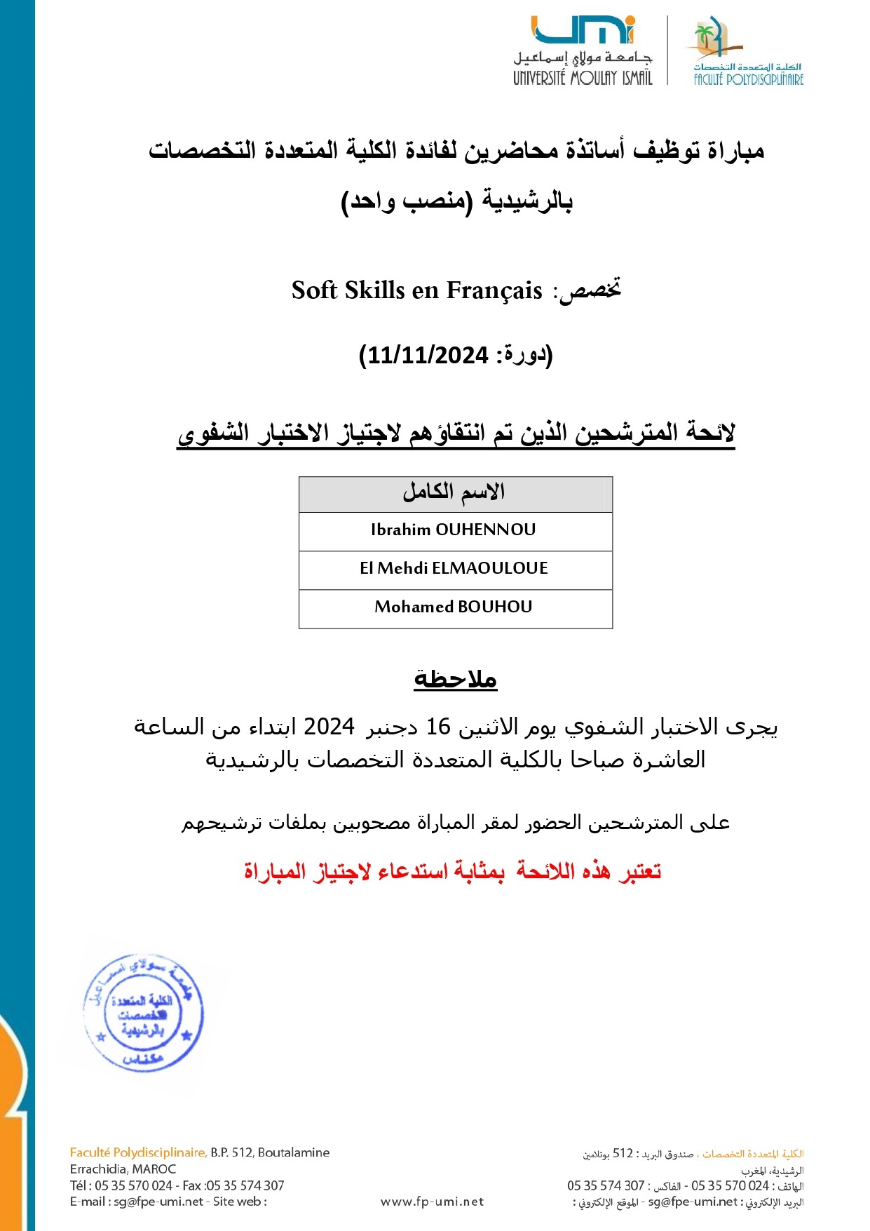 مباراة توظيف أساتذة محاضرين لفائدة الكلية المتعددة التخصصات بالرشيدية (منصب واحد) Soft Skills en Français : تخصص Vous devriez également aimer برمجة الاختبارات الشفوية لامتحانات الكفاءة المهنية برسم سنة 20229 mars 2023 افتتاح أشغال الاجتماع الخامس للجنة الفنية المغربية المصرية المشتركة للتعاون في مجال البحث العلمي9 mai 2014 جائزة التفوق برسم السنة الجامعية 2013-20143 décembre 2014