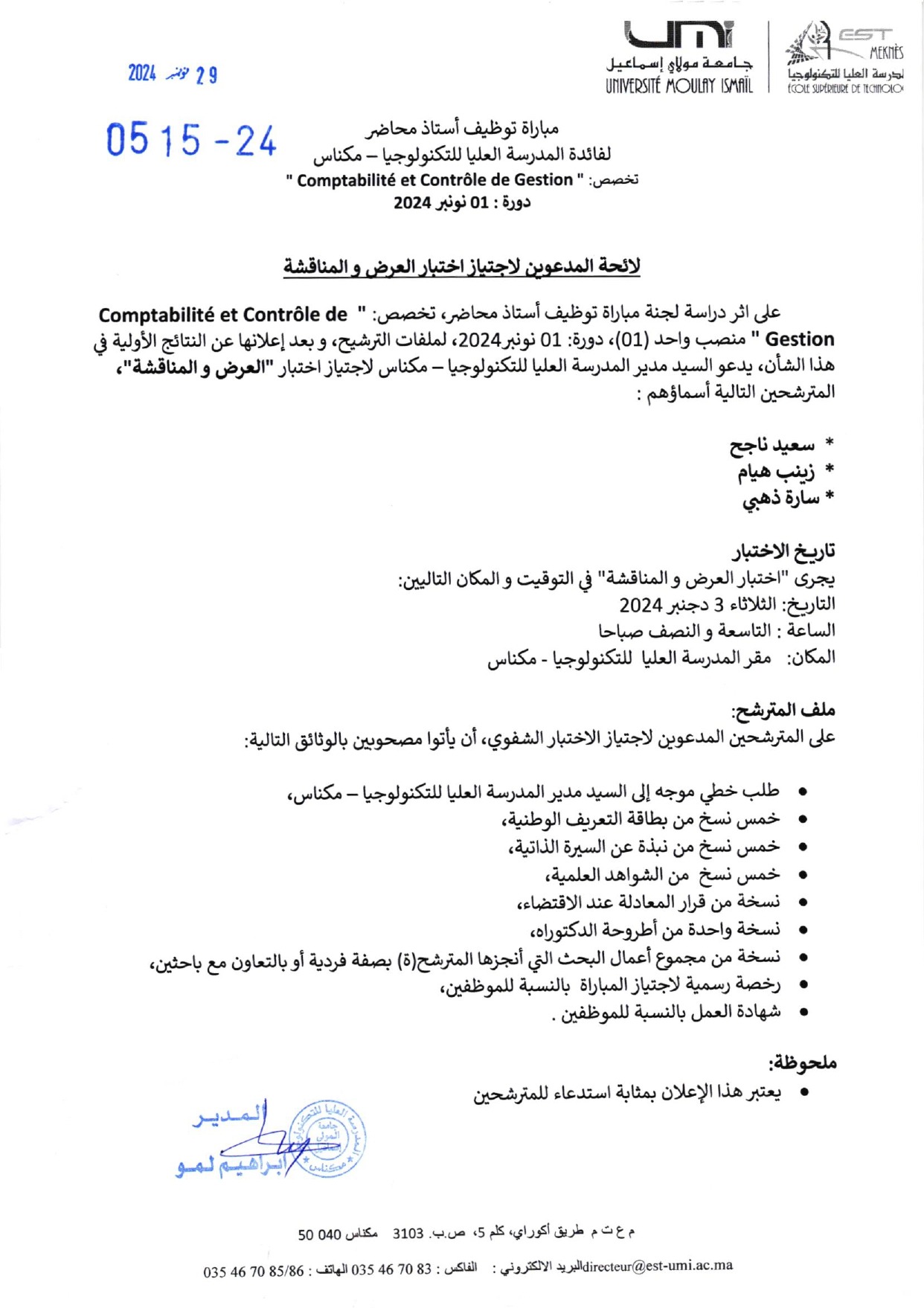 مباراة توظيف أستاذ محاضر لفائدة المدرسة العليا للتكنولوجيا – مكناس Comptabilité et Contrôle de Gestion : تخصص Vous devriez également aimer Séminaire « Ecole de l’Entrepreneuriat »4 février 2015 Formation pour la mise en ligne des revues de l’UMI30 avril 2015 Appels à projets Erasmus+9 novembre 2016