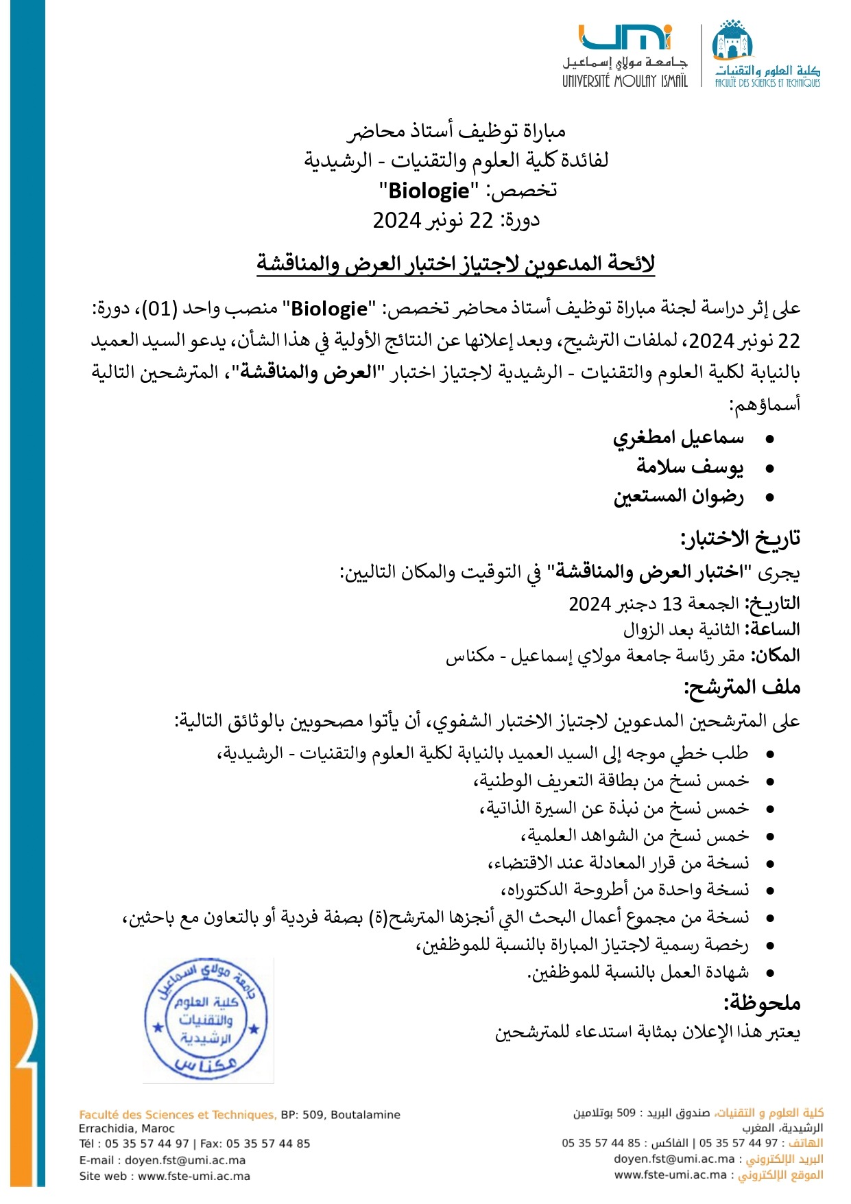– Intelligence artificielle : النتيجة النهائية لمباراة توظيف أستاذ واحد محاضر بكلية العلوم القانونية والاقتصادية والاجتماعية بمكناس – تخصص24 décembre 2024