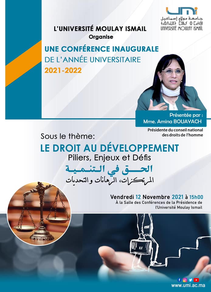 تنظم جامعة مولاي إسماعيل ندوة وطنية في موضوع الحق في التنمية :المرتكزات الرهانات والتحديات. وذالك يوم الجمعة 12 نونبر 2021، برئاسة الجامعة على الساعة الثالثة بعد الزوال، من تأطير السيدة أمينة بوعياش رئيسة المجلس الوطني لحقوق الإنسان.