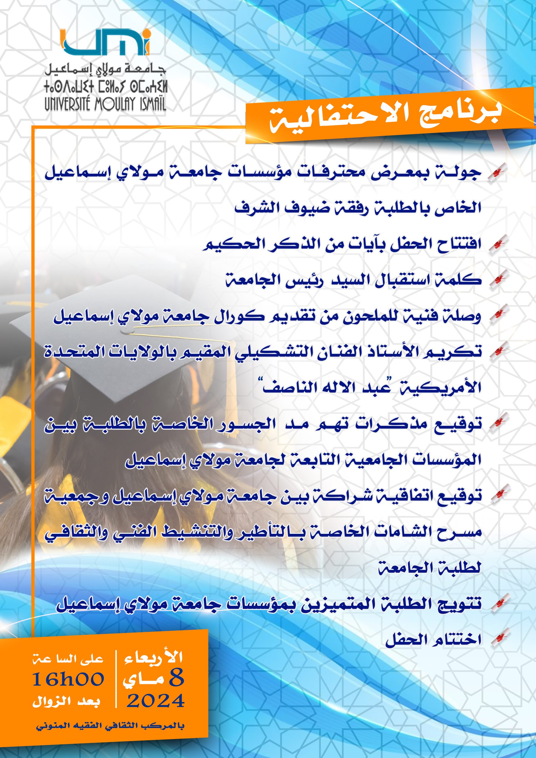 تنظم جامعة مولاي إسماعيل بمكناس احتفالية خاصة يوم 08 ماي 2024 وذلك بمناسبة تتويج الطلبة المتفوقين للسنة الجامعية 2022-2023 بمختلف المؤسسات التابعة لها، وهي مناسبة كذلك لعرض أعمال محترفات طلبة المؤسسات، كما سيتم تقديم وصلة غنائية في فن الملحون يقدمها كورال جامعة مولاي إسماعيل لفن الملحون