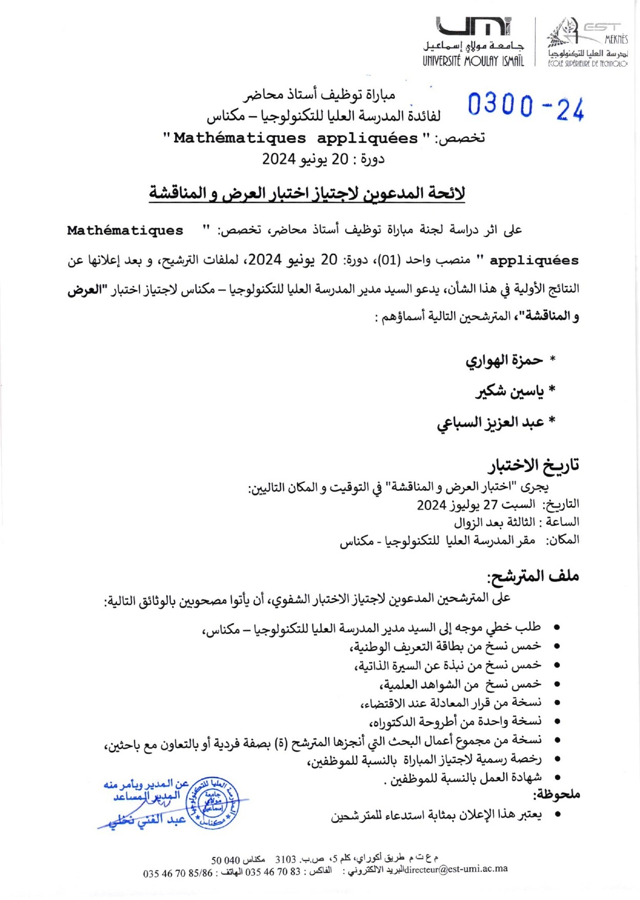 :مباراة توظيف أستاذ محاضر لفائدة المدرسة العليا للتكنولوجيا – مكناس – تخصص » Mathématiques appliquées Vous devriez également aimer النتيجة النهائية لمباراة توظيف أستاذ محاضر تخصص: ديداكتيك التربية الإسلامية30 octobre 2024 Espagne: Bourses d’études de Master – 2019/20205 juillet 2019 FST-E : The International Meeting on Applied Mathematics in Errachidia (IMAME’2016)26 avril 2016