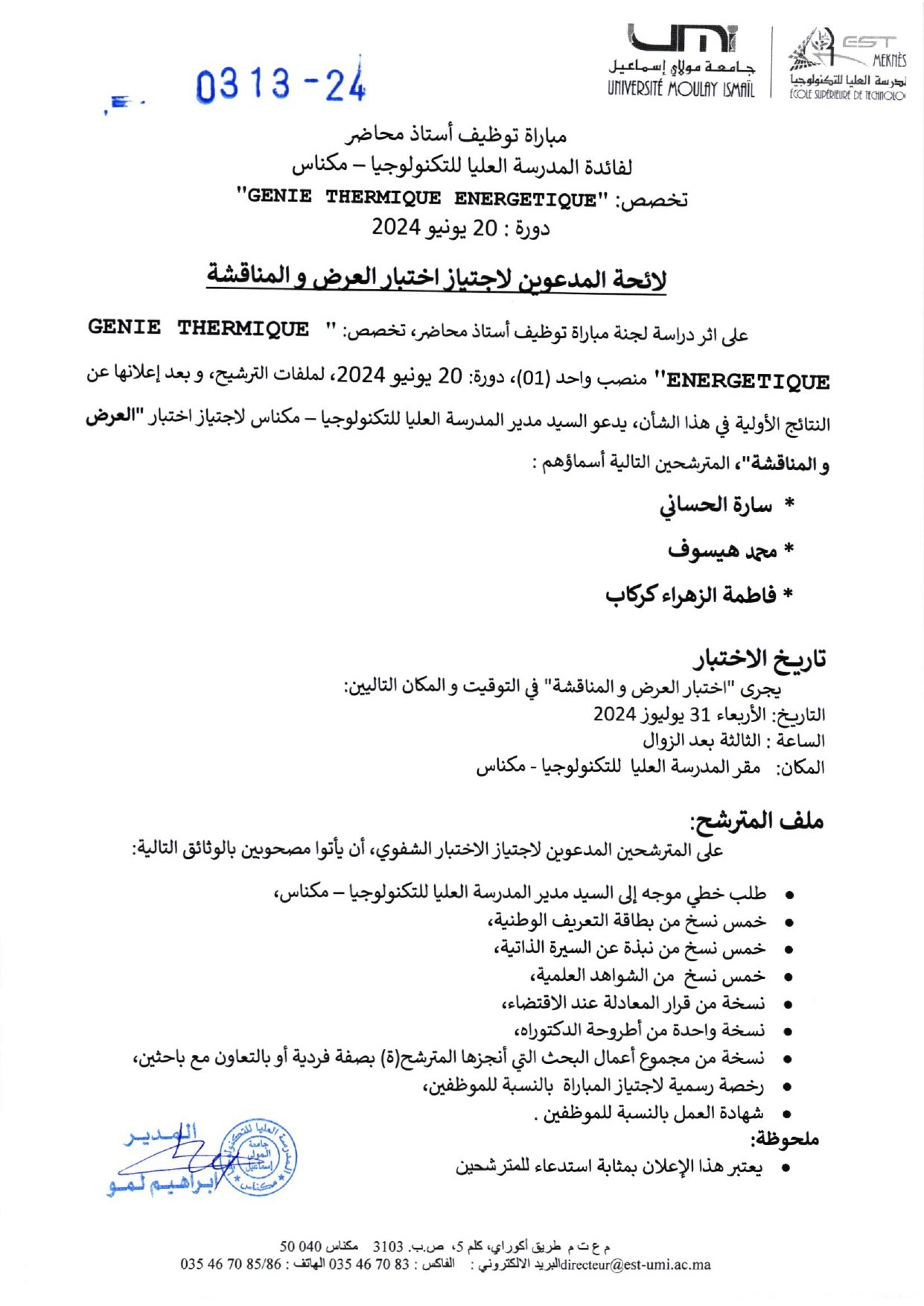 مباراة توظيف أستاذ محاضر لفائدة المدرسة العليا للتكنولوجيا – مكناس « GENIE THERMIQUE ENERGETIQUE » : تخصص Vous devriez également aimer النتائج النهائية للمقابلة الانتقائية الخاصة بشغل مناصب المسؤولية برئاسة جامعة مولاي اسماعيل17 janvier 2022 Maroc-Belgique / Règlement Concours annuels pour les années 2020-20212 septembre 2020 bonne année et meilleurs vœux 202131 décembre 2020