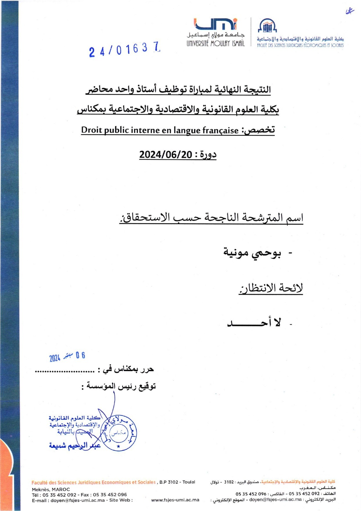 Droit public interne en langue Française : النتائج النهائية لمباريات توظيف أستاذ محاضر تخصص Vous devriez également aimer سنة ميلادية سعيدة31 décembre 2014 اليوم العالمي للمرأة9 mars 2021 Fatima Al Fihri project: 2nd WEBINAR for the second call for applications (EMA2 Lot 1)27 janvier 2014