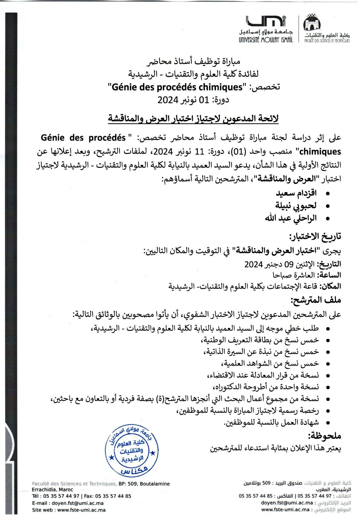 مباراة توظيف أستاذ محاضر لفائدة كلية العلوم والتقنيات – الرشيدية« Génie des procédés chimiques » تخصص Vous devriez également aimer formation sur teams11 décembre 2020 Journée internationale de la femme8 mars 2016 Semaine Mondiale de l’Entrepreneuriat6 novembre 2013