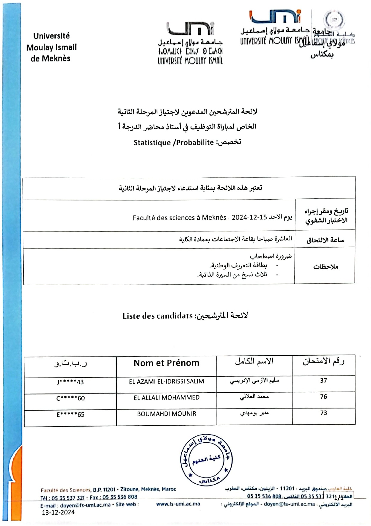 : لائحة المترشحين المدعوين لاجتياز المرحلة الثانية الخاص لمباراة التوظيف في أستاذ محاضر الدرجة أ تخصصstatistique / probabilité Vous devriez également aimer Bourses d’études au Sultanat de Brunei (2016-2017)6 janvier 2016 Appels à Projets « ERANETMED » et « ARIMNet2 »21 avril 2016 Colloque national sur la radioprotection du patient29 janvier 2019