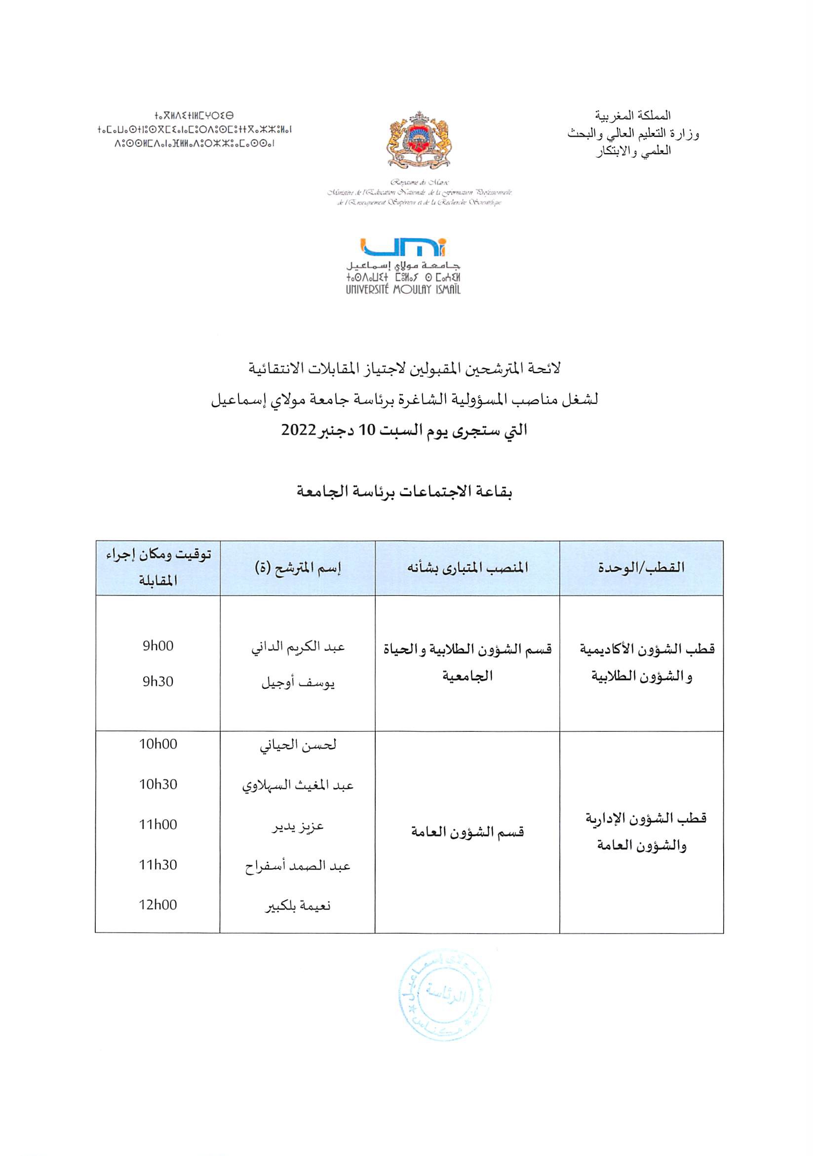 liste des convoqués le samedi 10/12/2022 au sein de la présidence pour passer les entretiens oraux pour la sélection des chefs de divisions des « Affaires générales » et des « Affaires estudiantines et de la vie universitaire ».