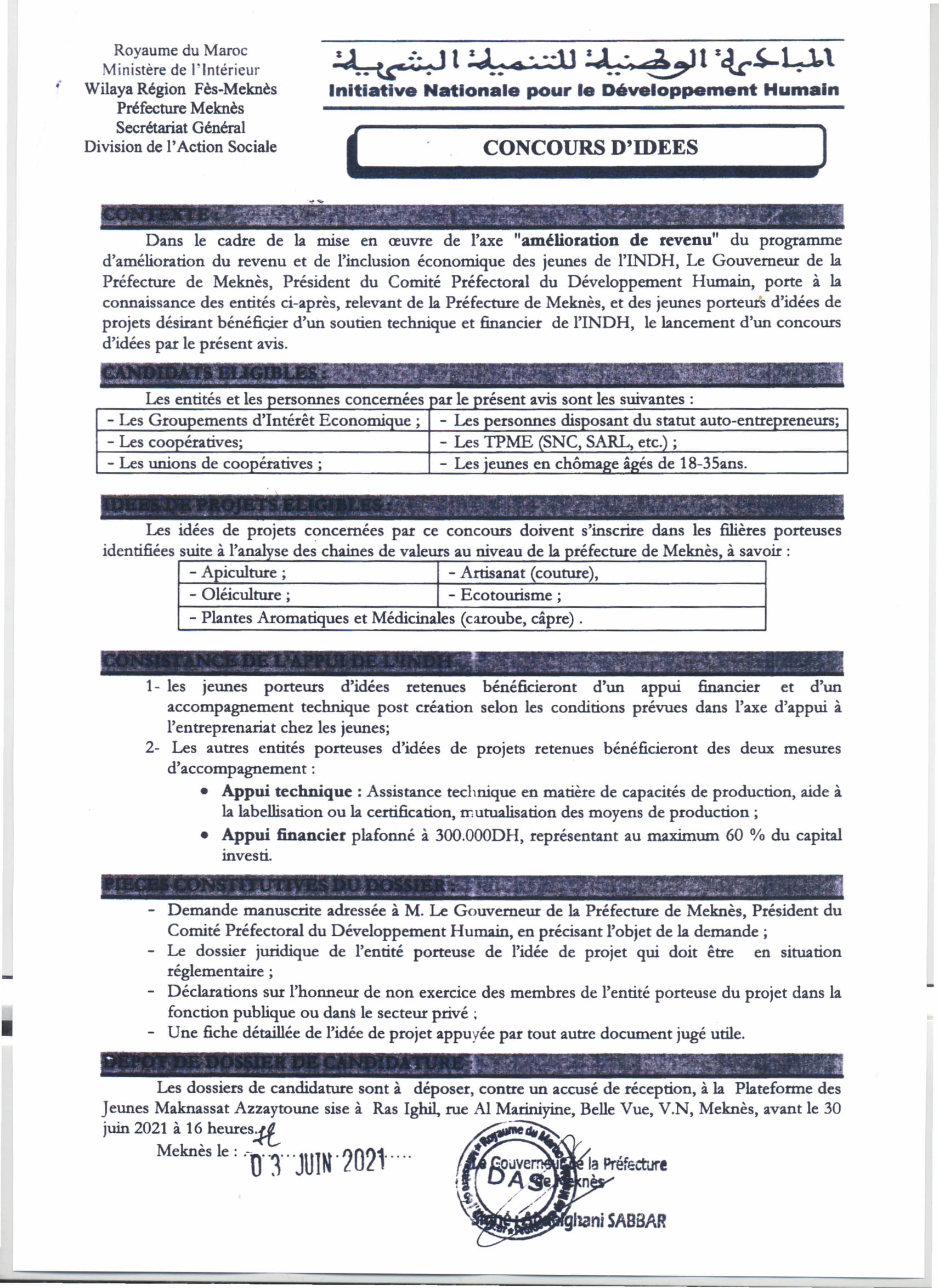 Dans le cadre de la mise en œuvre de l’axe « amélioration de revenu » du programme d’amélioration du revenu et de l’inclusion économique des jeunes de l’INDH , le Gouverneur de la Préfecture de Meknès, Président du Comité Préfectoral du Développement Humain, porte à la connaissance des jeunes porteurs d’idées de projets relevant de la préfecture de Meknès et qui désirent bénéficier d’un soutien technique et financier de l’INDH, le lancement d’un concours d’idées par le présent avis.