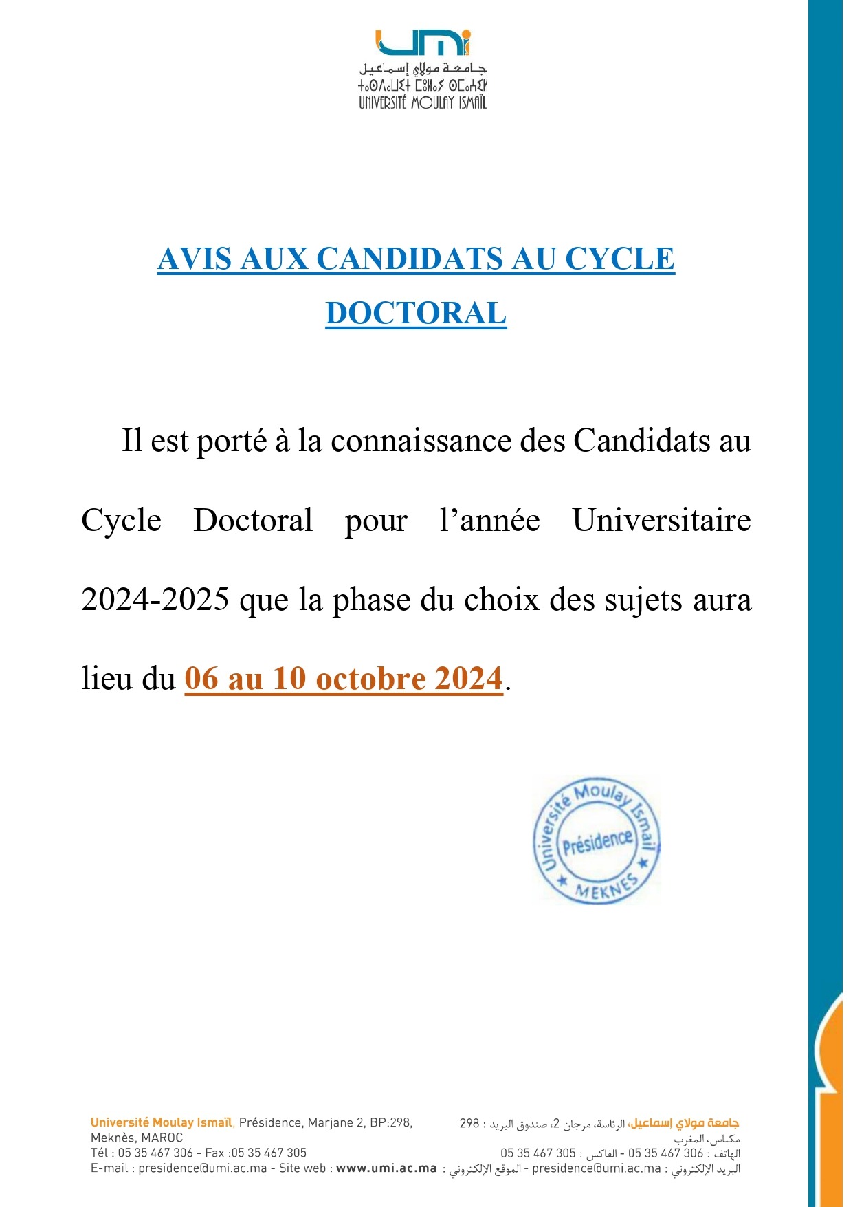 Il est porté à la connaissance des Candidats au Cycle Doctoral pour l’année Universitaire 2024-2025 que la phase du choix des sujets aura lieu du 06 au 10 octobre 2024.