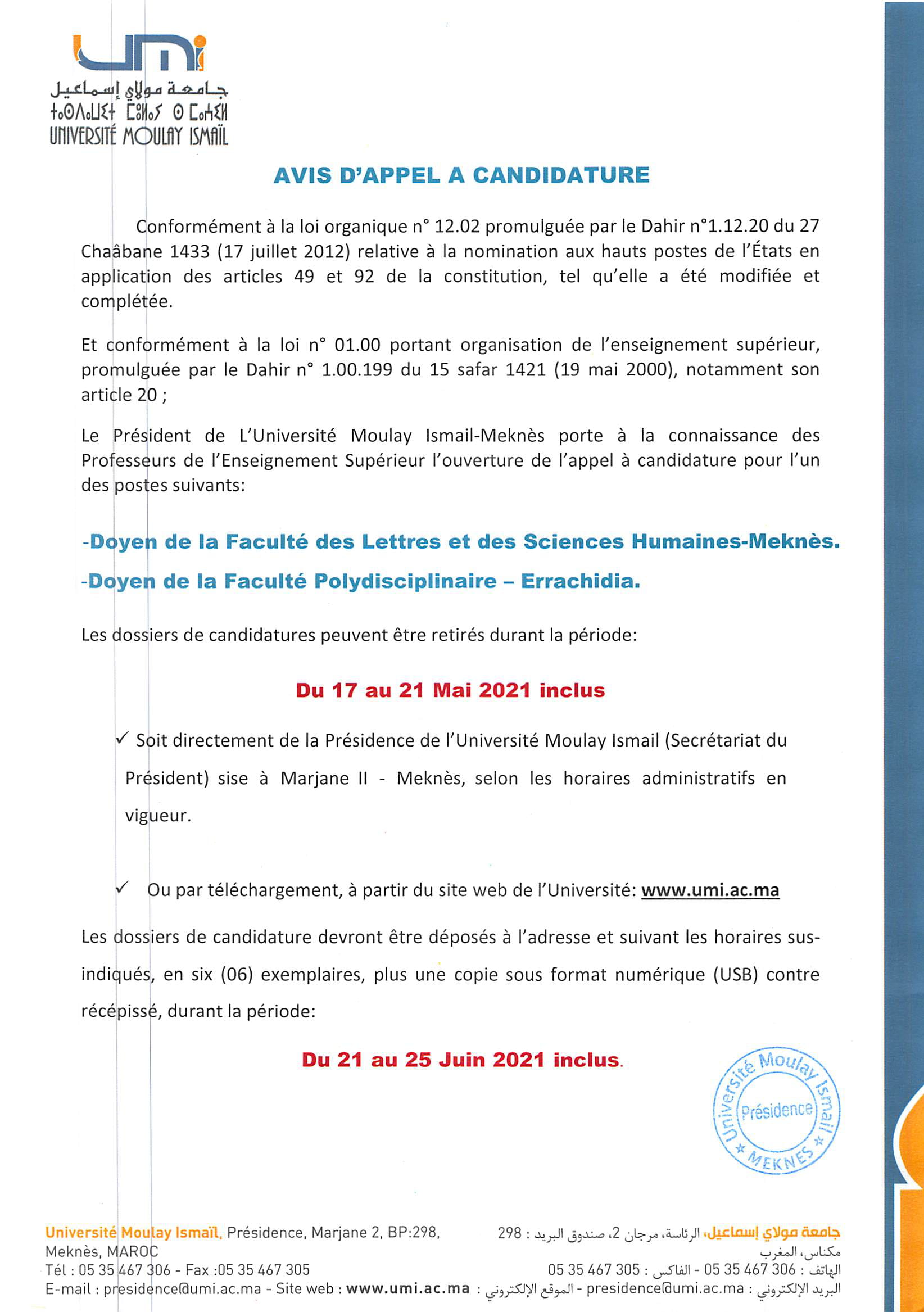 Vous devriez également aimer Revue de Presse N°: 13 de l’UMI – 202030 novembre 2020 Lancement de l’édition 2023 de l’appel à projets PHC Maghreb16 février 2022 التسجيل بالحي الجامعي بمكناس برسم الموسم الجامعي 2014/20136 septembre 2013