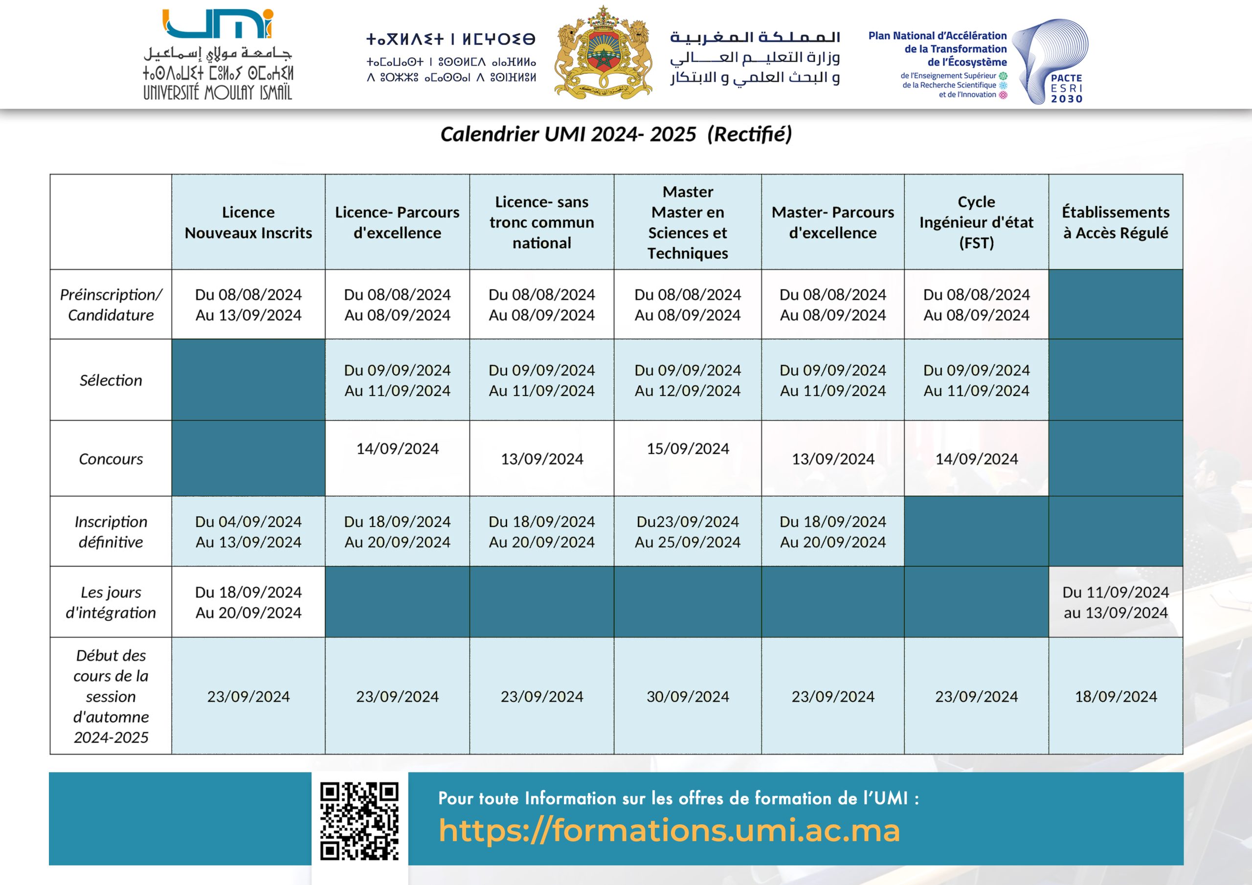 Calendrier UMI 2024- 2025 (Rectifié) Vous devriez également aimer الإعلان عن فتح الترشيحات لشغل مناصب رؤساء المصالح (FS)22 décembre 2023 Espagne: Bourses d’études de Master – 2019/20205 juillet 2019 Programmes des cours sur la Radio Régionale de Meknès et la Radio MEDINA FM du 10 Mai10 mai 2020
